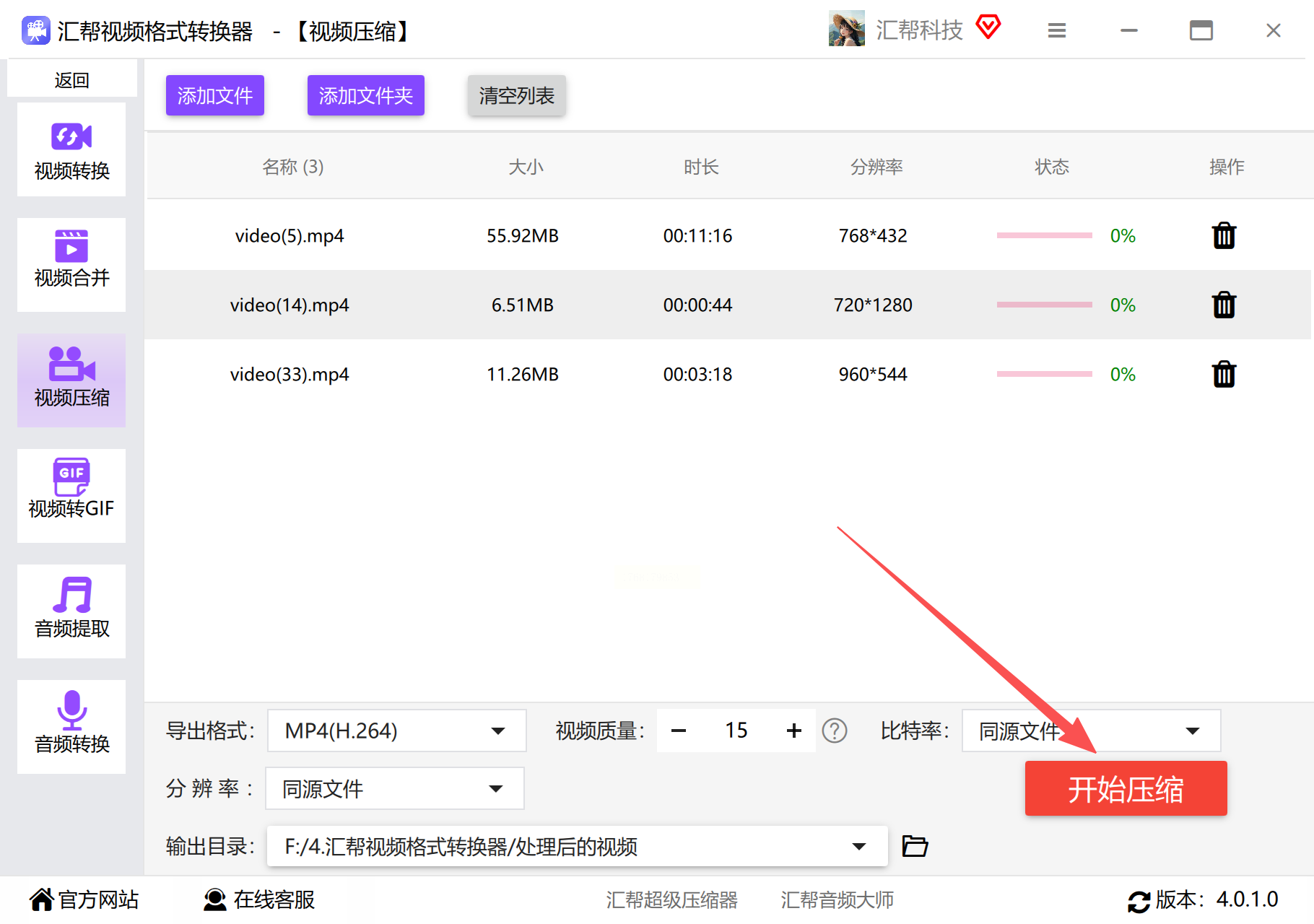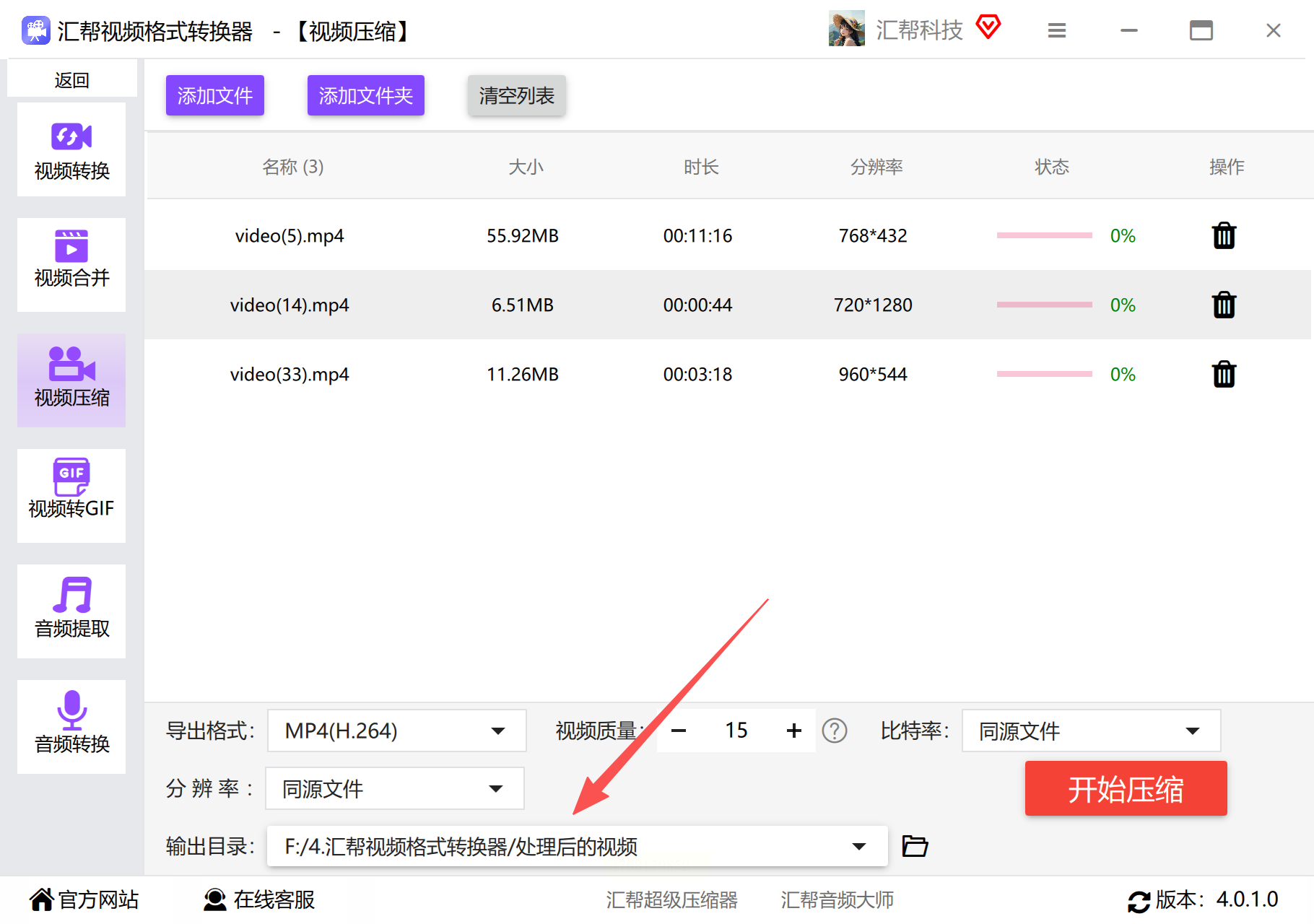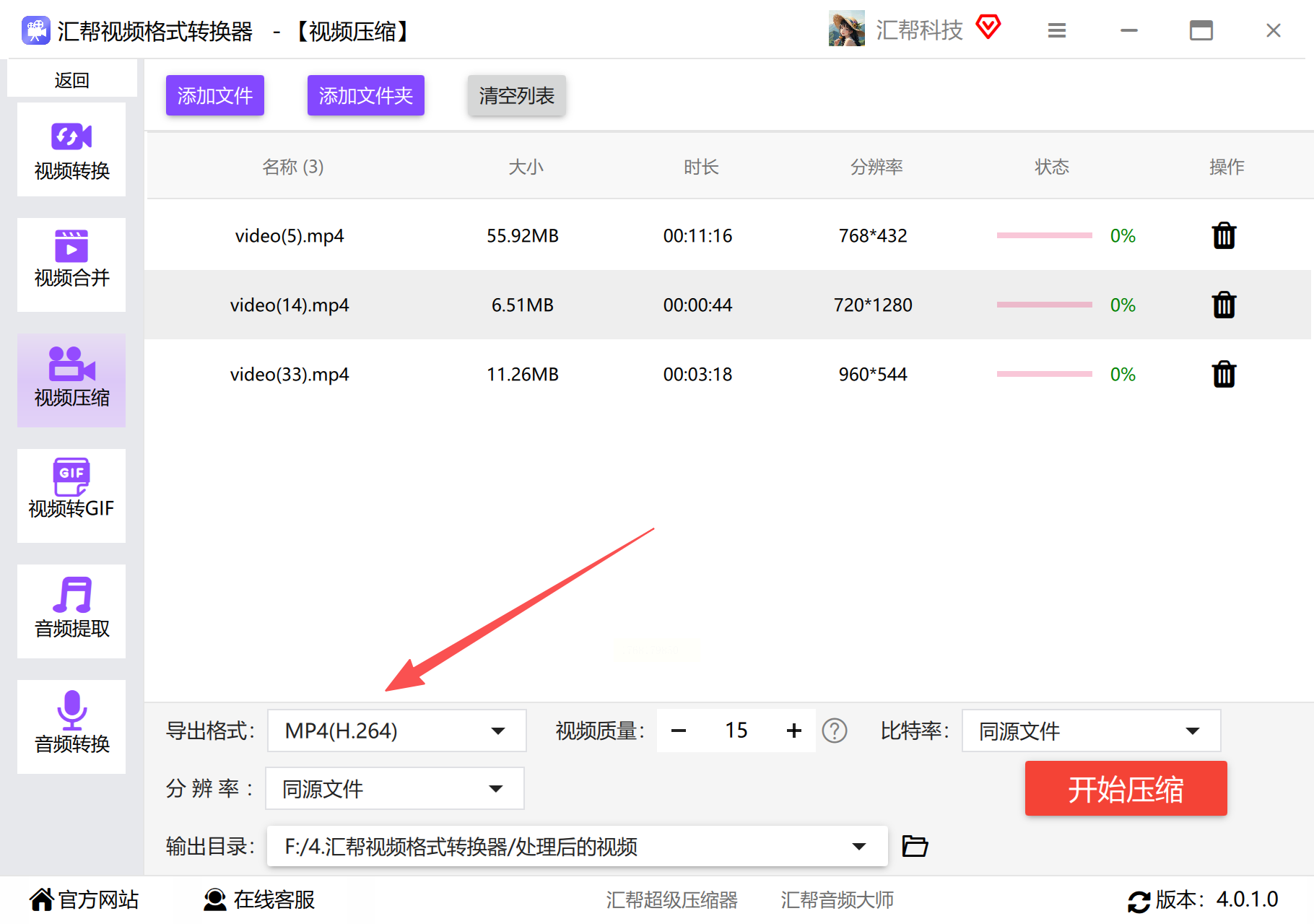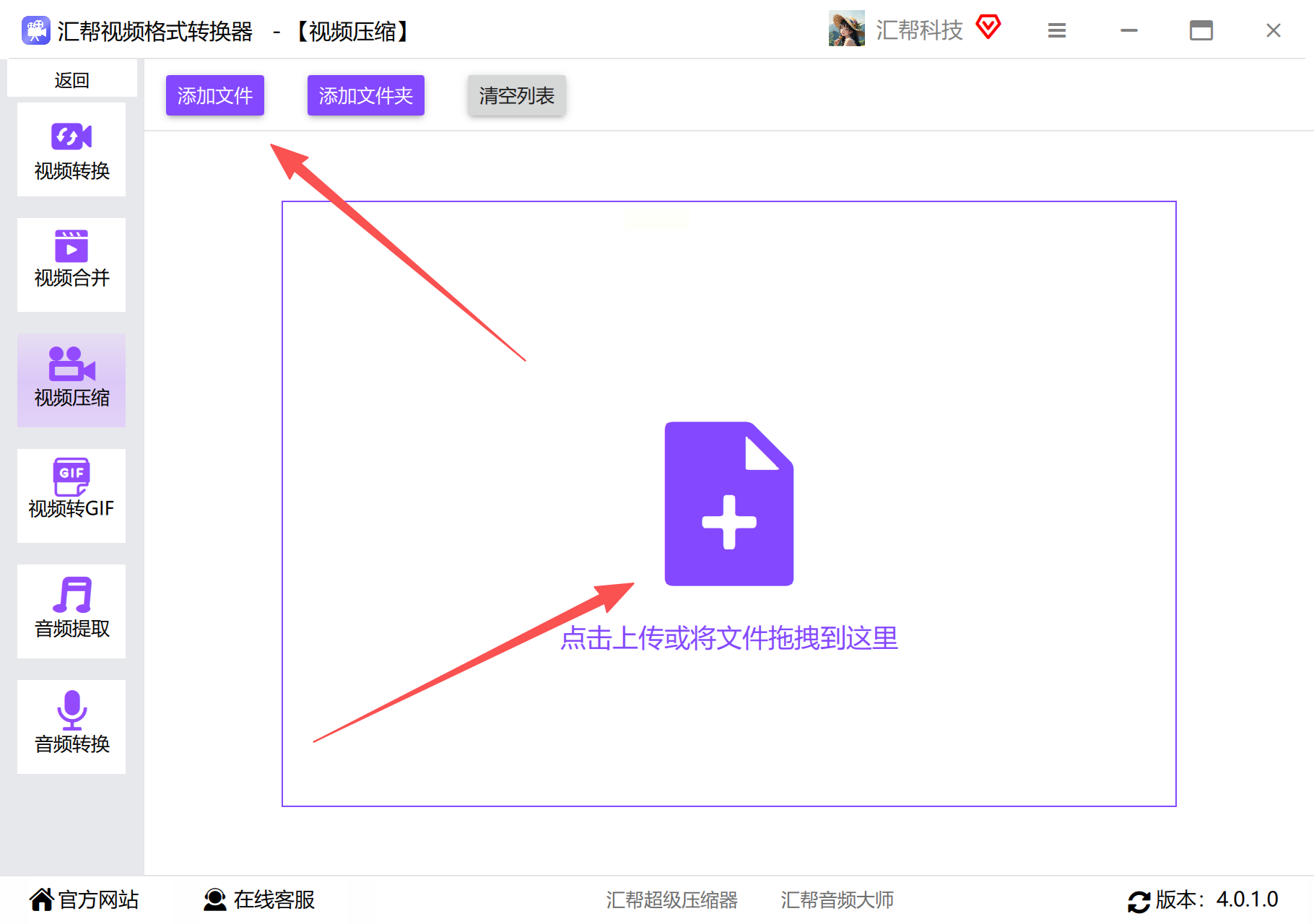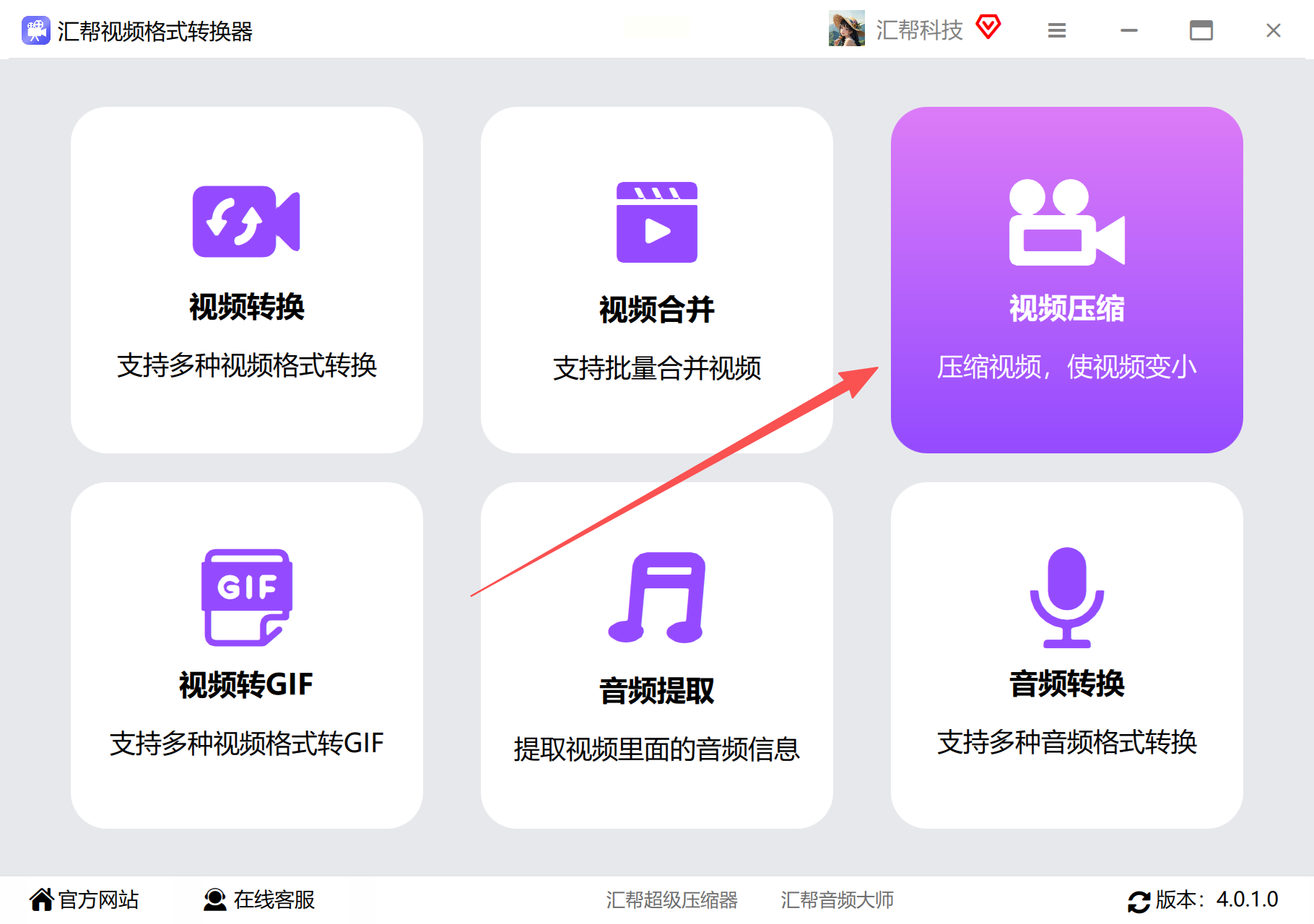 在电脑上打开已经安装好的“汇帮视频格式转换器”软件。启动后你会看到清晰的功能分类界面,这里我们需要找到并点击“视频压缩”选项,进入专门的压缩功能页面。
