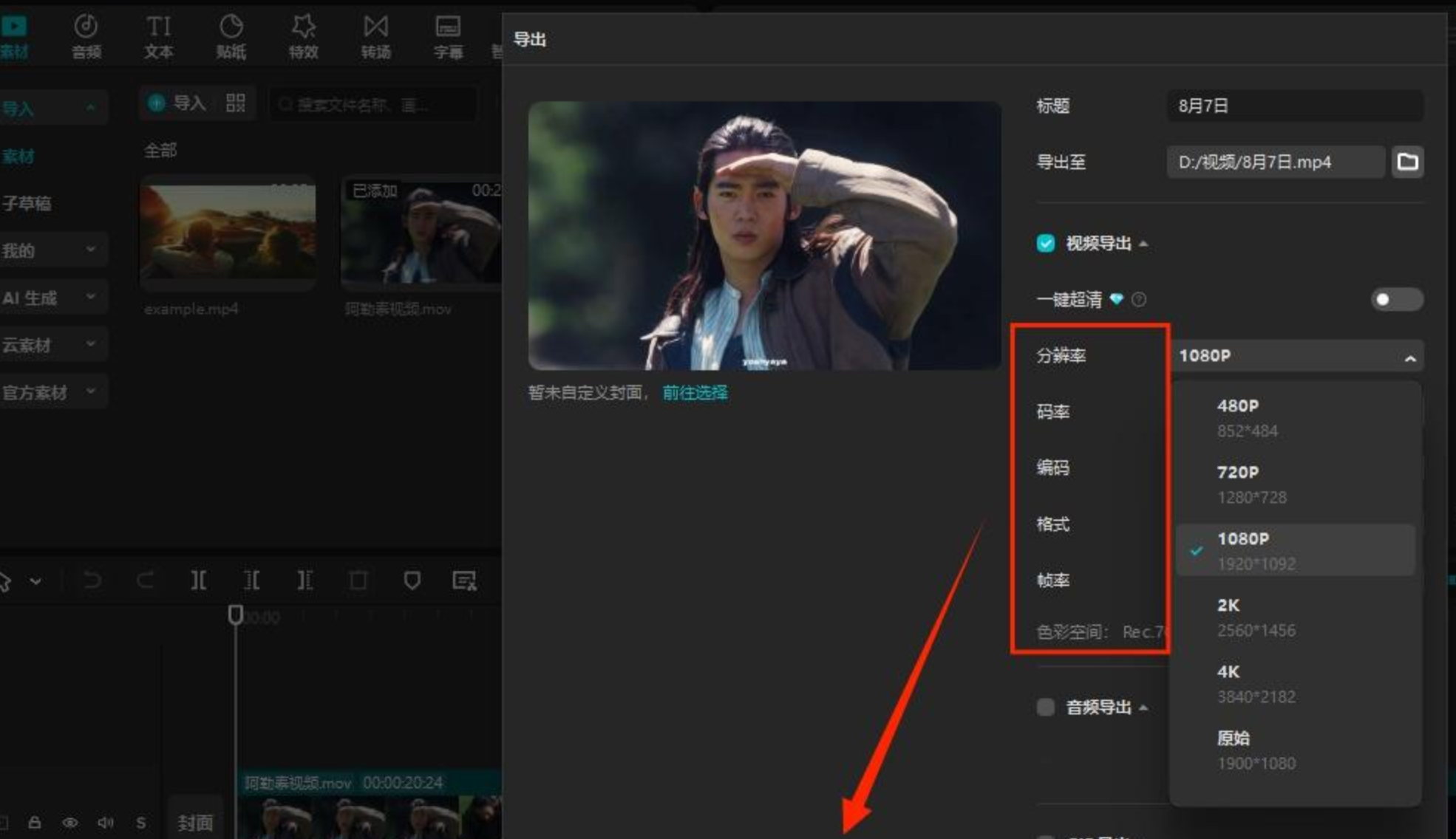 在导出设置界面,你会看到多个影响视频大小的选项: