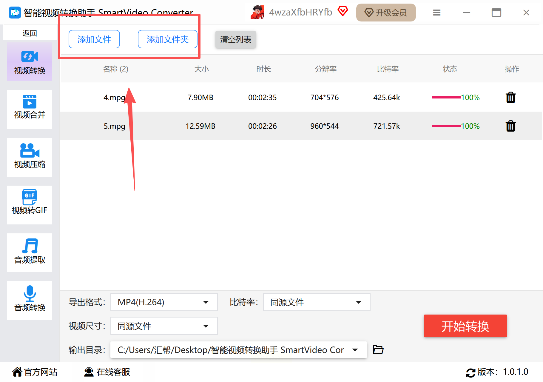 步骤1:打开软件后,在首页选择“视频转换”模块,点击“添加文件”导入多个mpg视频(支持同时添加10个以内文件)。