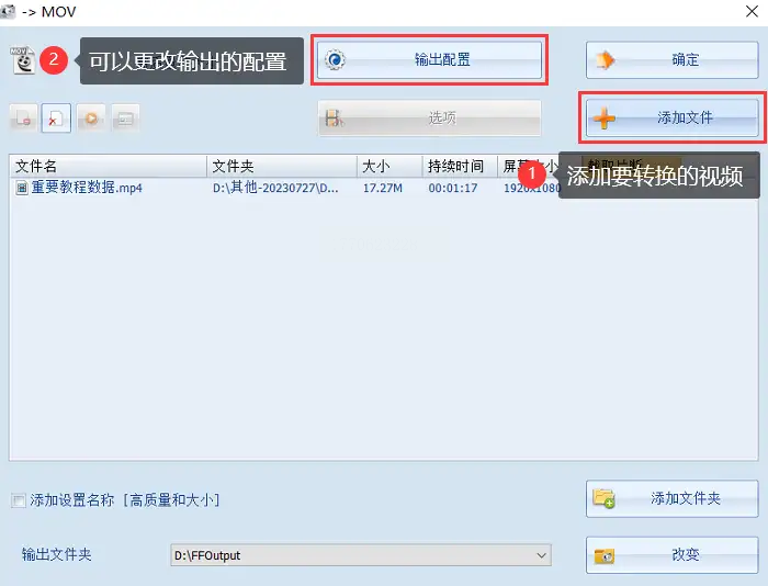 步骤2:点击“添加文件”导入视频,若需调整画质,点击“输出配置”可设置比特率、编码方式(H.264是主流选择)。