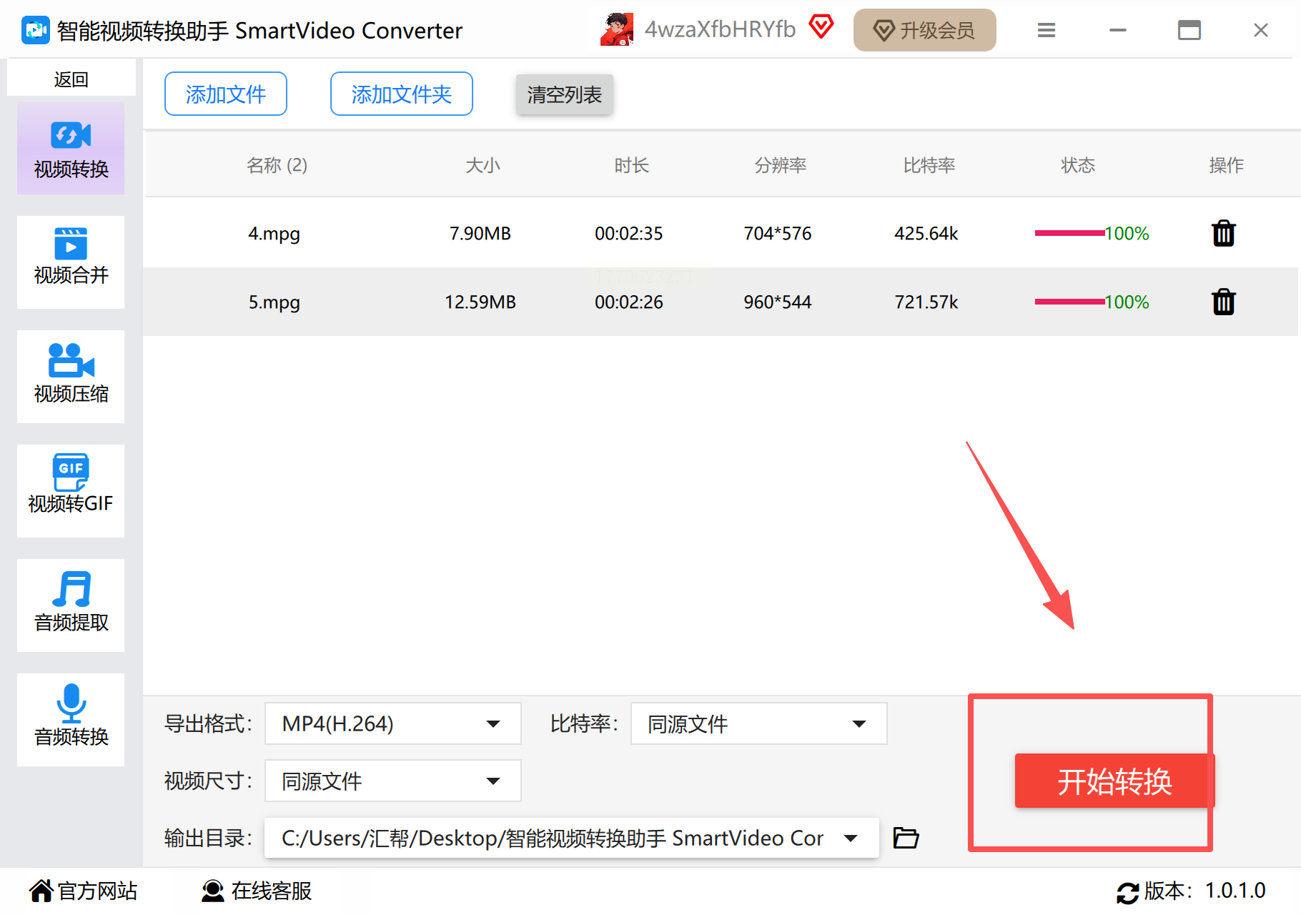 步骤3:检查输出格式是否为MP4,确认无误后点击“开始”按钮,转换过程中可暂停或取消任务。