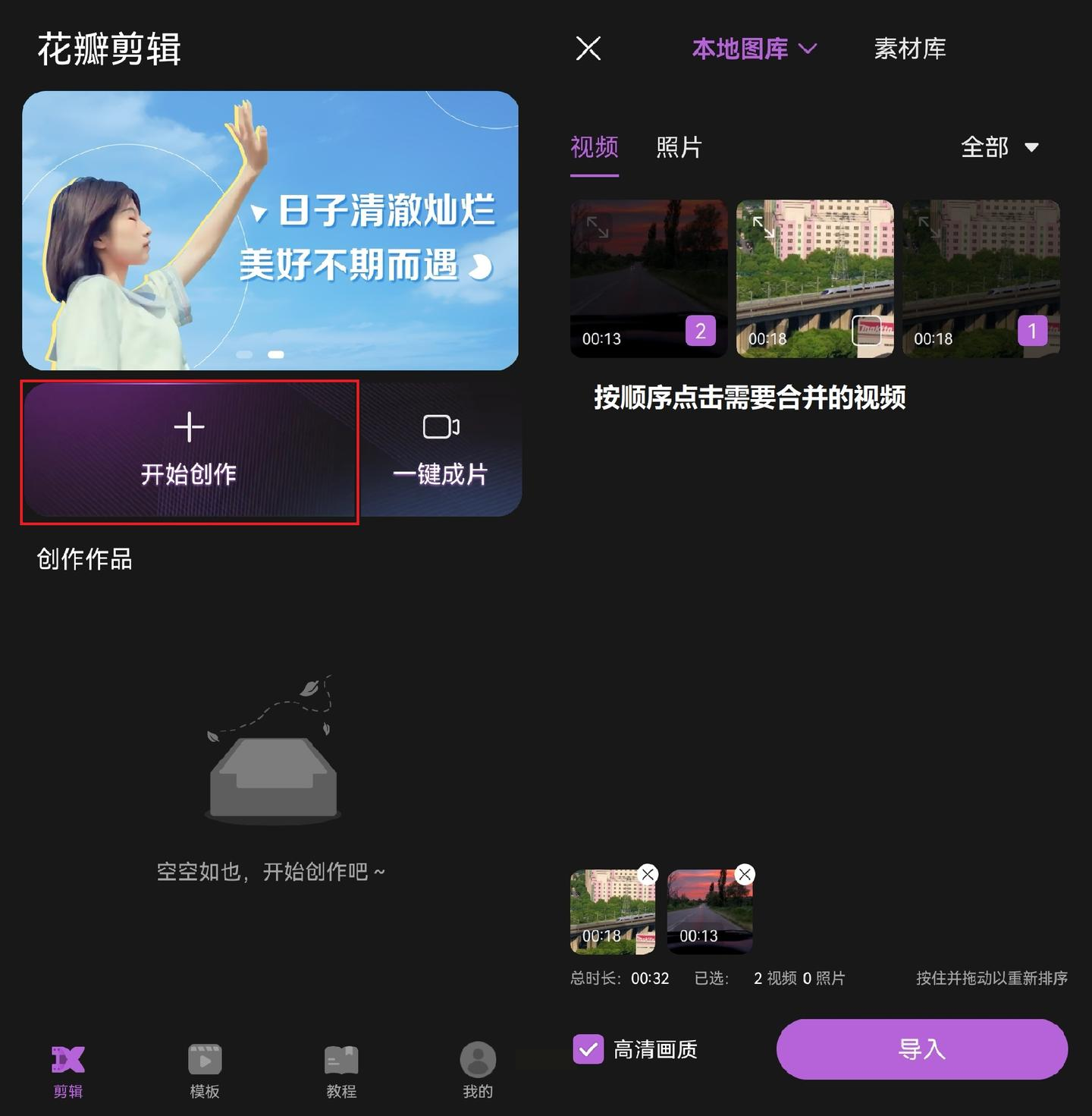 打开手机上的花瓣剪辑应用(如果没有可以在应用商店搜索下载),点击首页的【开始创作】,然后从手机相册里选择需要合并的视频,按照你想要的顺序依次选中。如果需要合并照片,也可以在相册里选择照片一起导入。