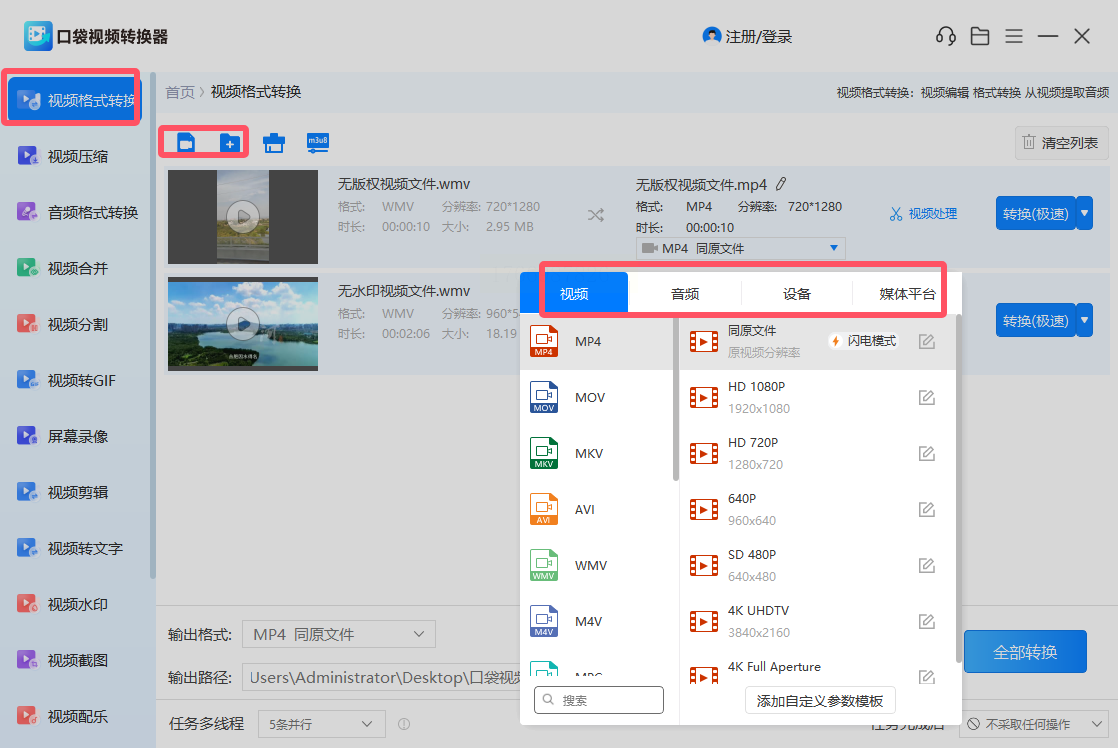 打开软件,选择“视频格式转换”功能。点击添加按钮导入WMV文件。在输出设置中,在格式列表里选择“MP4”,并可以选择合适的分辨率。然后点击转换按钮,等待完成即可。