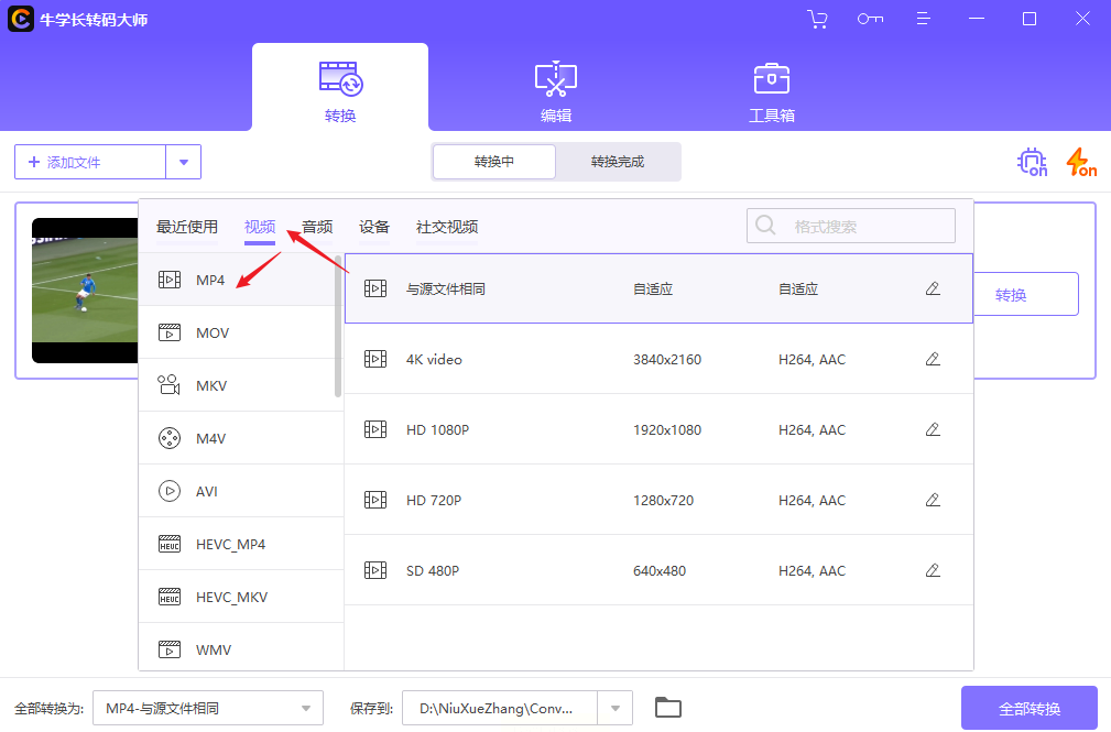 步骤二:选择输出格式为MP4,并设置画质选项。