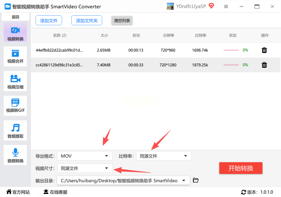步骤三:文件添加后,在下方设置输出格式为MOV,并可以调整比特率和尺寸等参数。