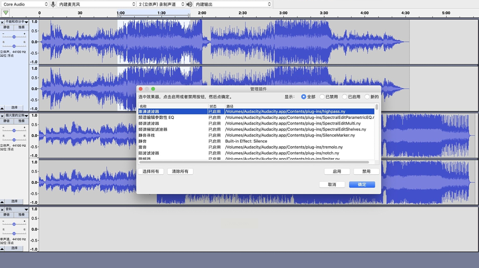 软件会自动分离音轨,波形图显示音频内容,可通过“效果”菜单调整音量、降噪等参数。