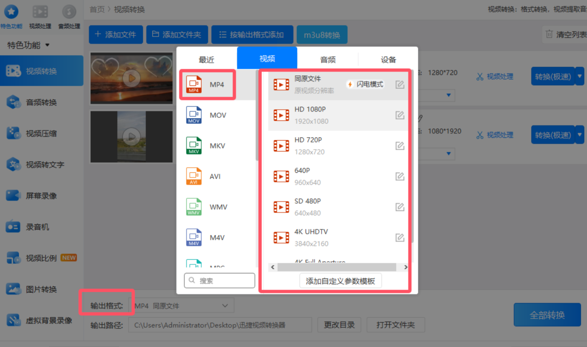 - 格式:选择"MP4",点击"自定义"可设置H.264编码(主流选择)