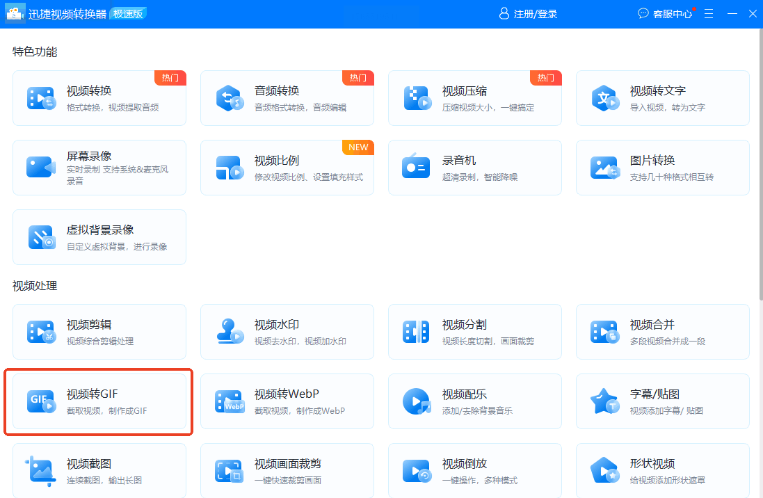 步骤一:启动软件后,在主界面功能模块中定位“视频转GIF”选项。该功能兼容MP4、AVI、MOV等十余种常见视频格式,确保您无需预先转换视频格式即可直接操作。