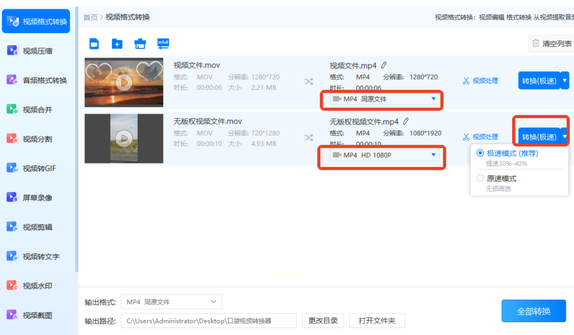 3. 重要文件建议使用"原速模式"转换,确保画质无损