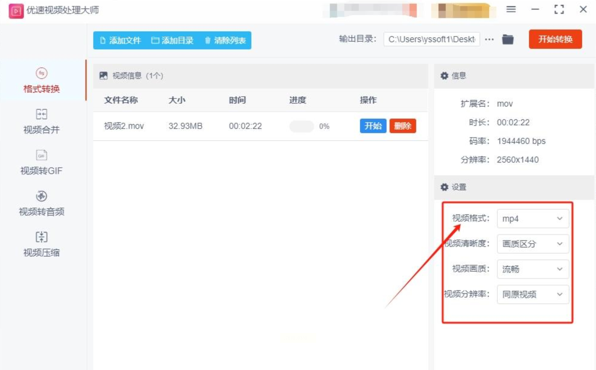 3. 在"输出格式"下拉菜单中选择MP4,建议保留原分辨率(如1080P)