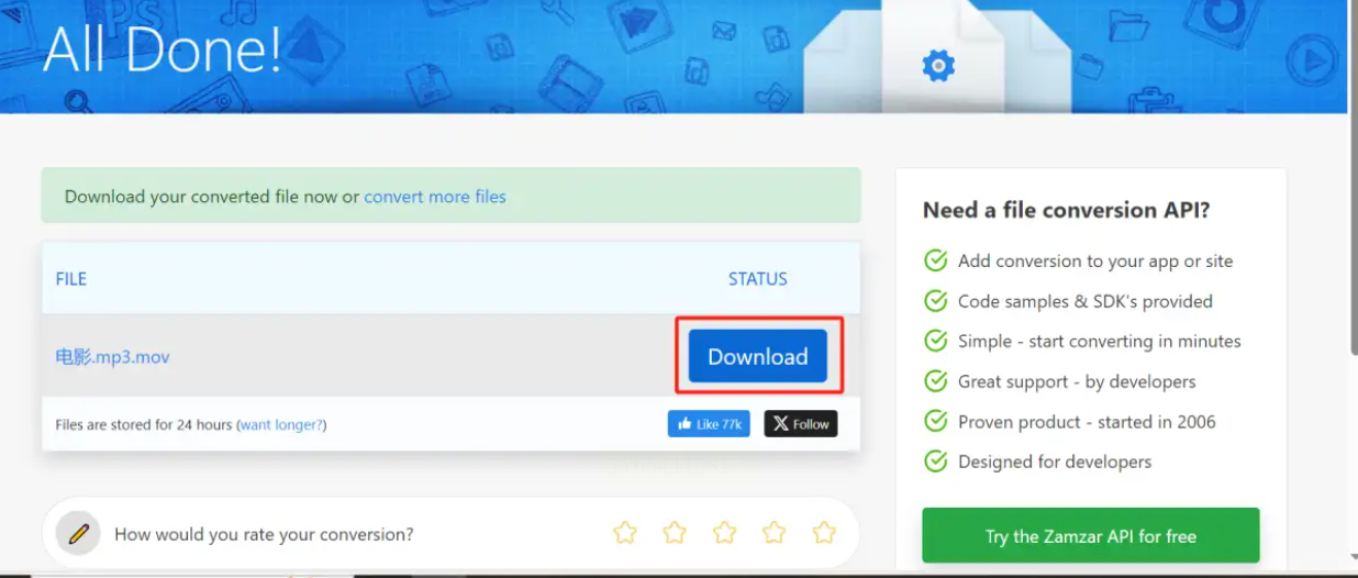 点击"Convert Now"按钮开始处理,进度条会显示转换进度。完成后点击"Download"按钮,系统会自动保存转换后的MP4文件到本地。注意:免费版文件转换后会保留水印,付费版可去除。