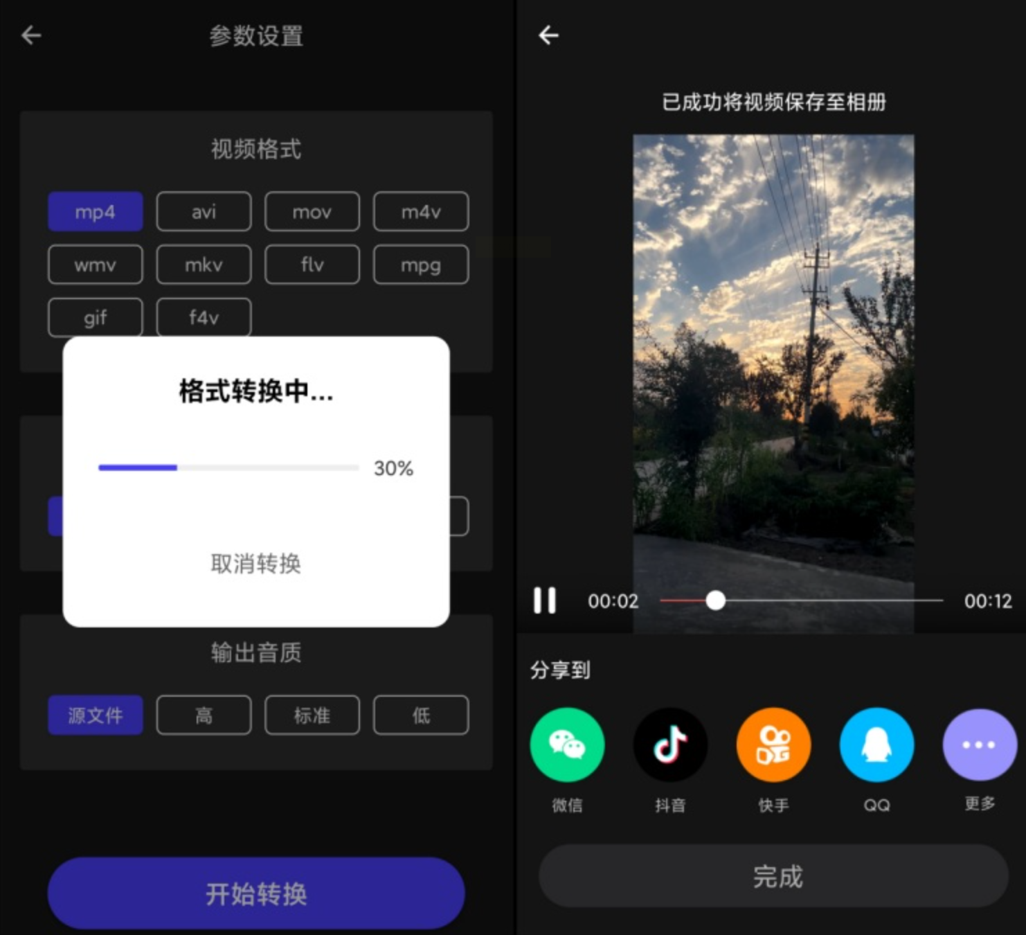 点击"开始转换"后,系统会自动处理文件。转换完成后,点击"预览"按钮查看效果,确认无误后保存到相册。注意:转换过程中尽量保持网络连接稳定。