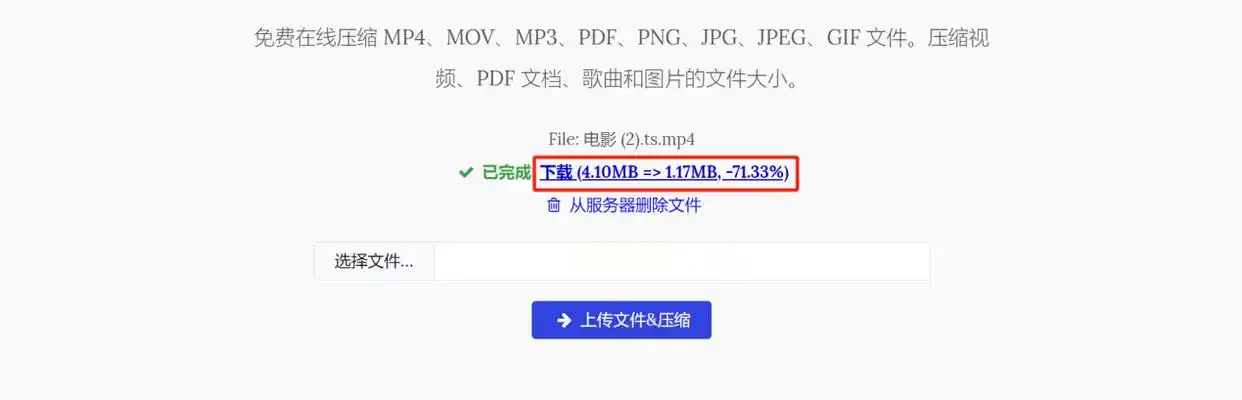 点击“Compress”按钮开始处理,等待进度完成后,系统会自动生成压缩后的视频文件。点击“Download”即可保存到本地,操作全程无需注册账号,适合临时快速压缩需求。