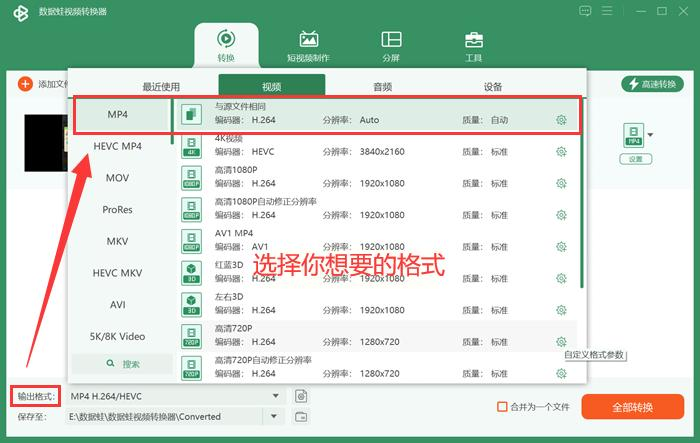 在输出设置里,把格式选为MP4。这里有个很实用的功能,你可以直接选择预设的设备型号,比如iPhone、安卓手机什么的,软件会自动匹配最合适的参数。