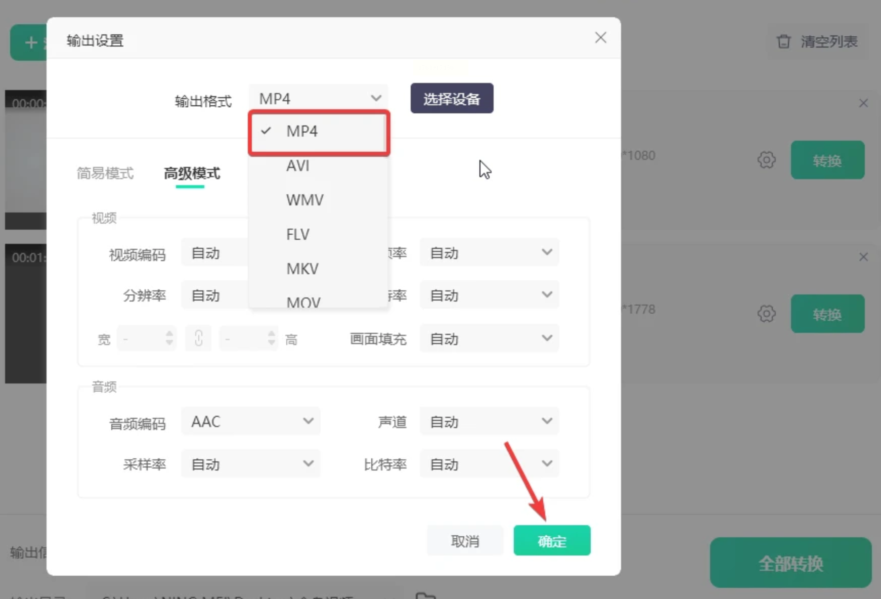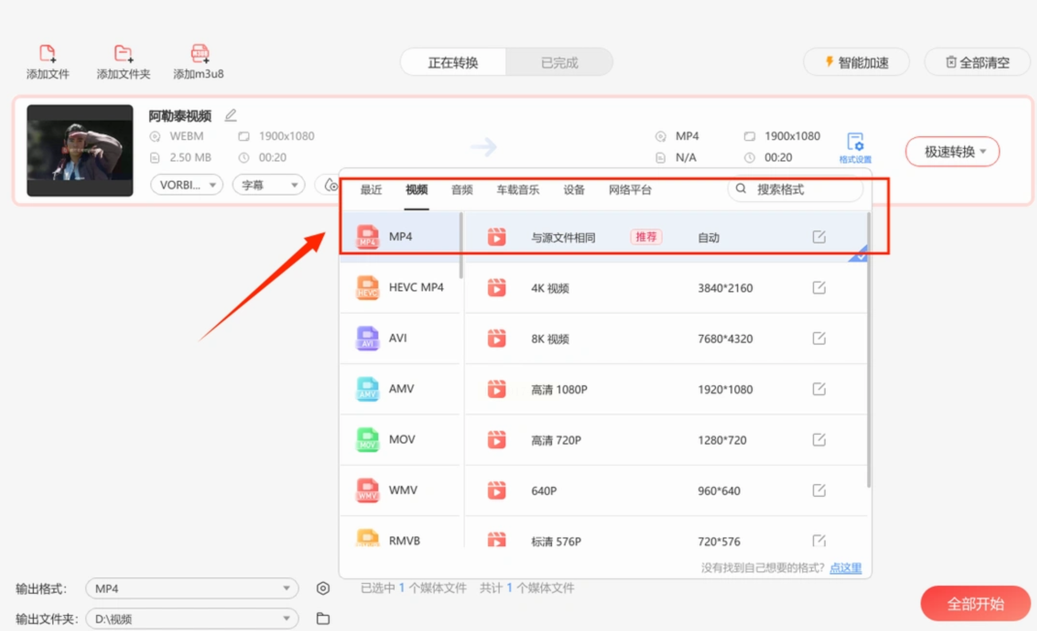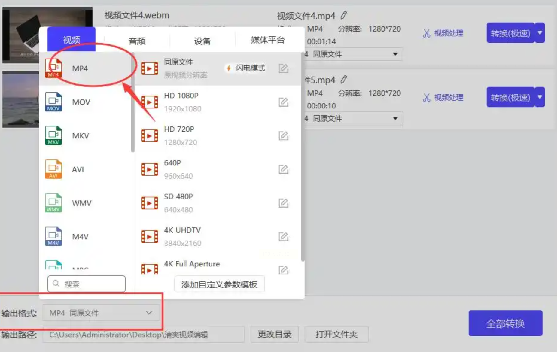 2. 视频导入后,在输出设置区域找到“输出格式”下拉菜单,从中选择“MP4”格式。同时,你还可以设置视频的品质等级。最后,点击“全部转换”按钮,软件就会在后台帮你完成格式转换的工作。