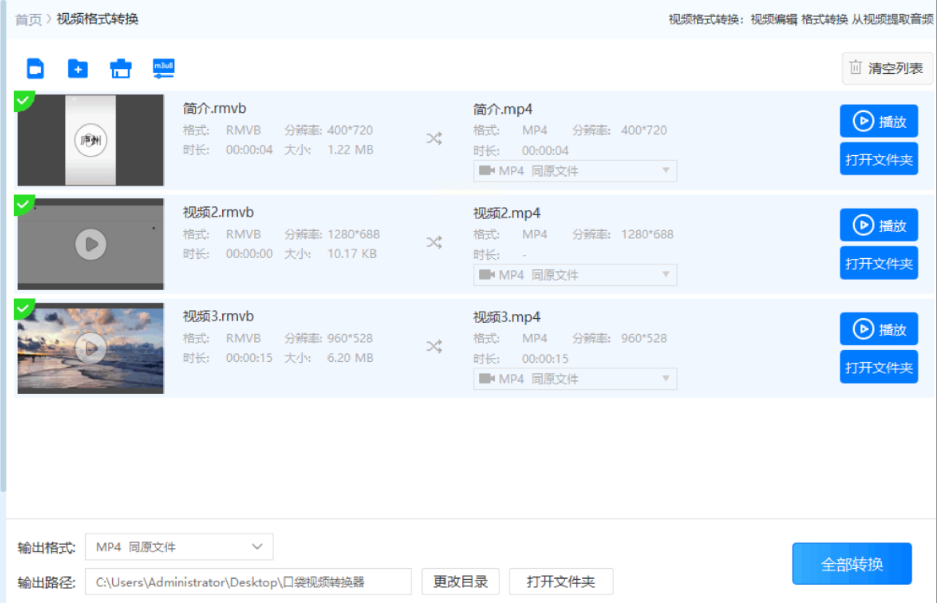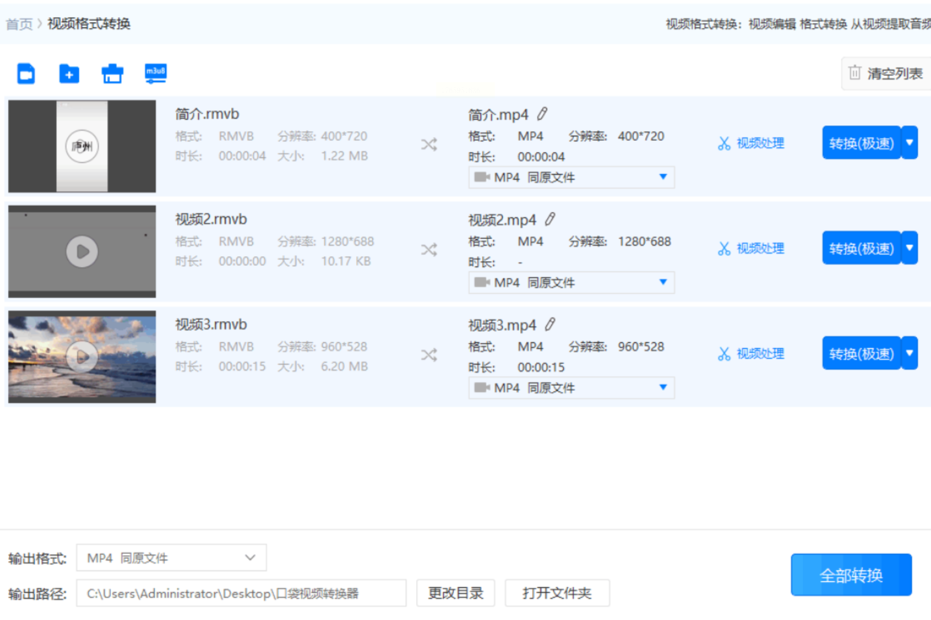 确认无误后,点击“全部转换”按钮,稍等片刻,所有视频就会变成通用的MP4格式,方便传到手机里观看。