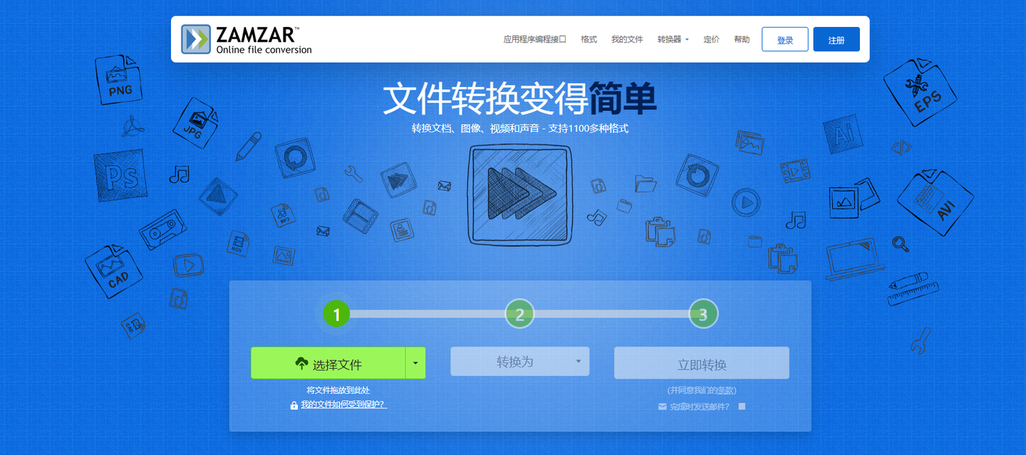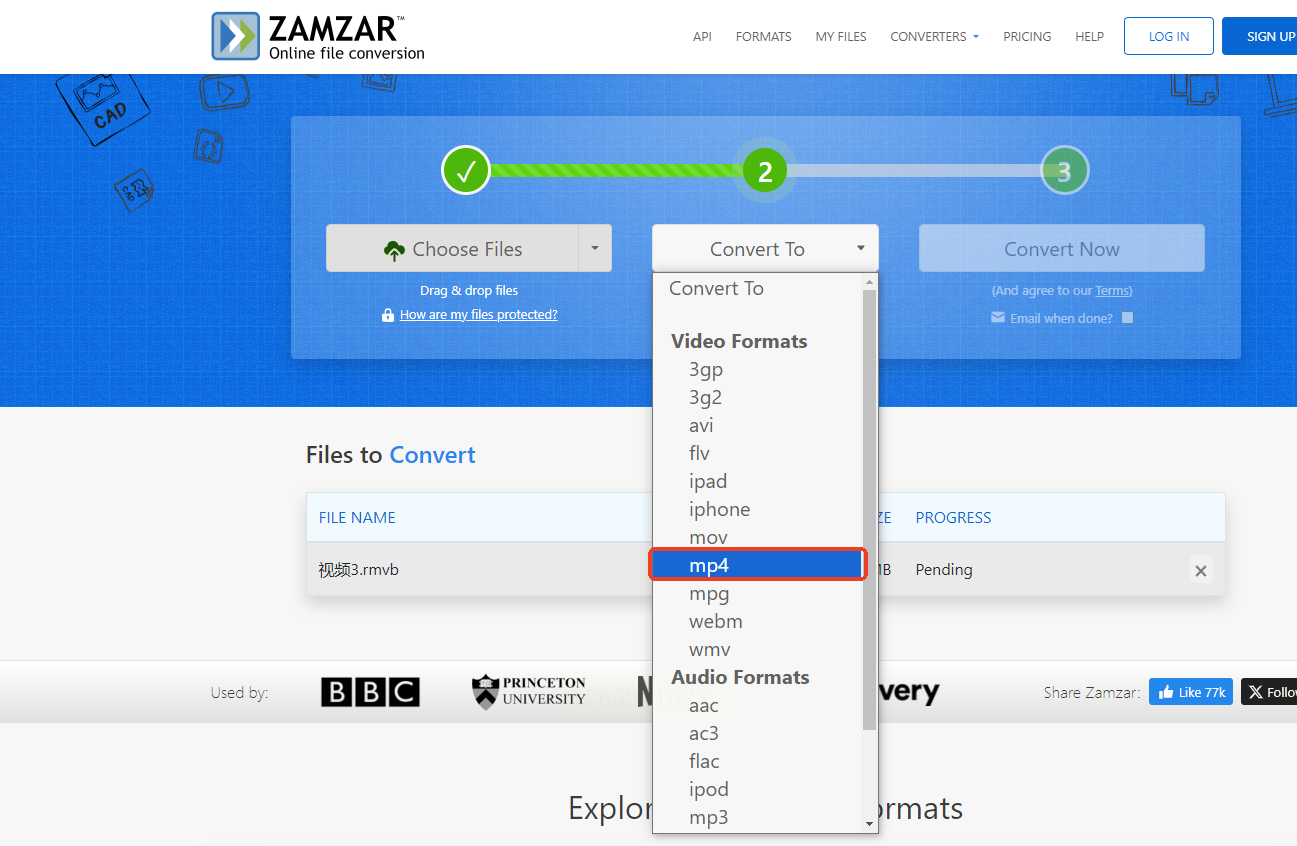 访问Zamzar网站,首页就能看到上传按钮,点击“Choose Files”选中电脑里的RMVB文件。