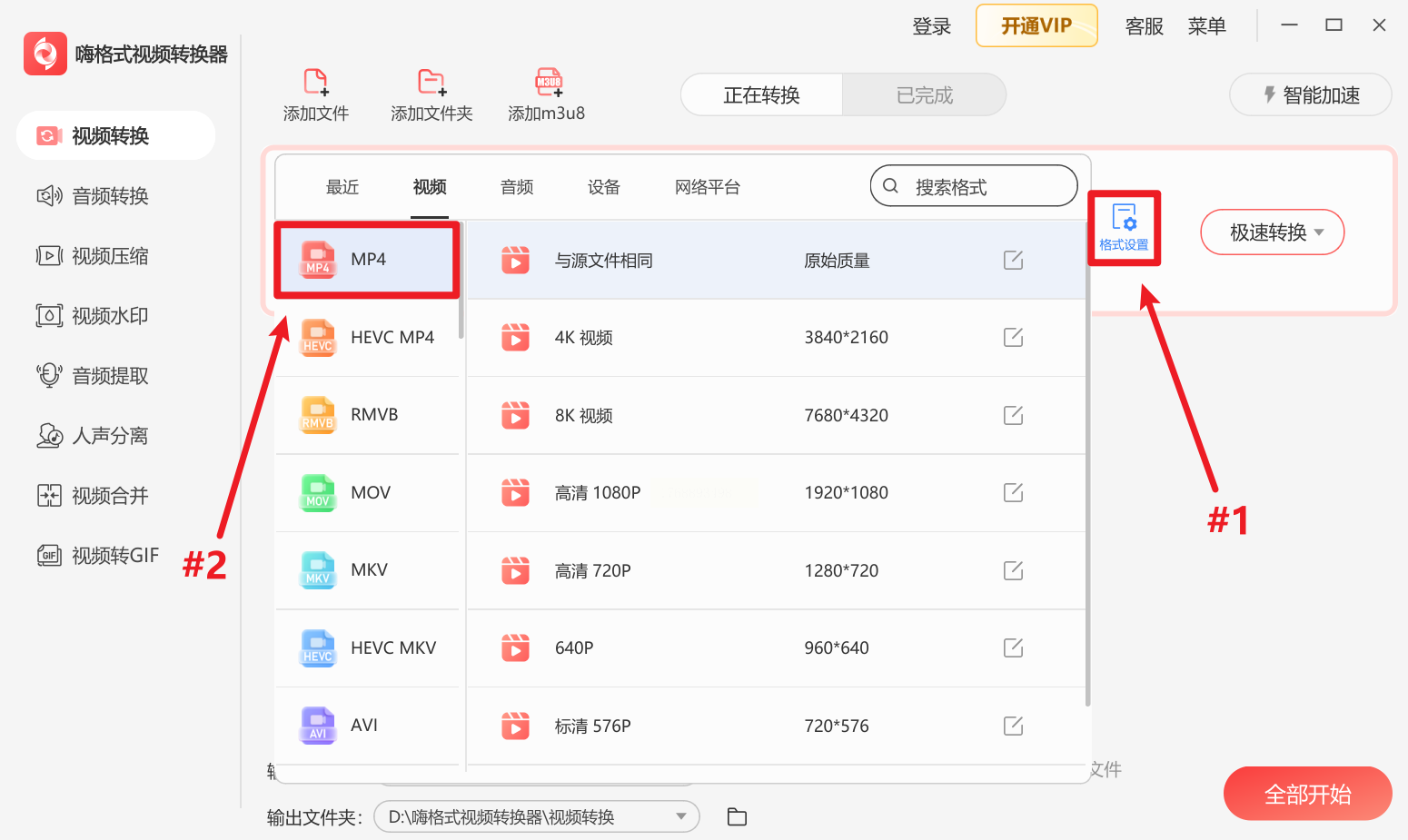 步骤三:输出格式选MP4,分辨率提供五种选项,确认后保存。