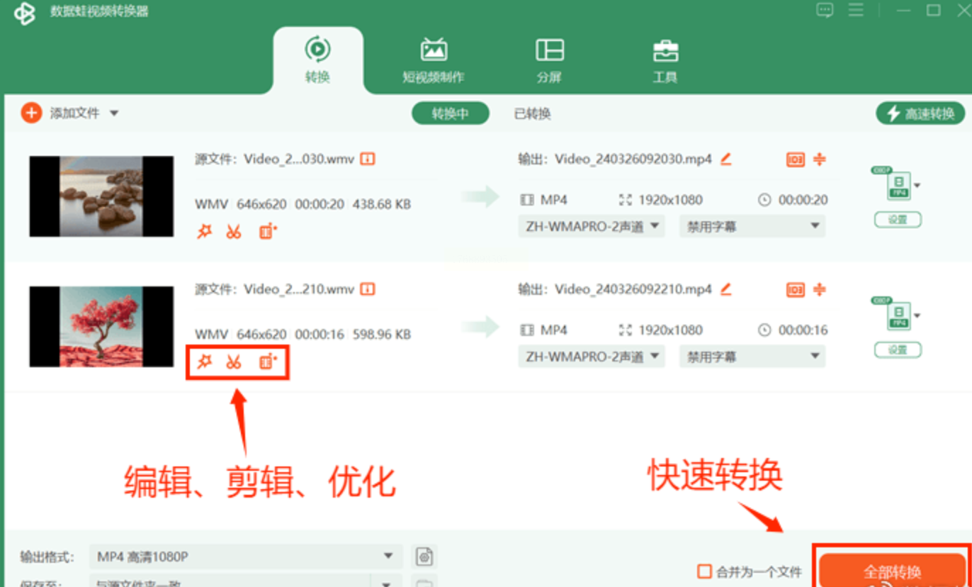 步骤四:转换前还能剪辑或优化视频,处理完一键批量转换。