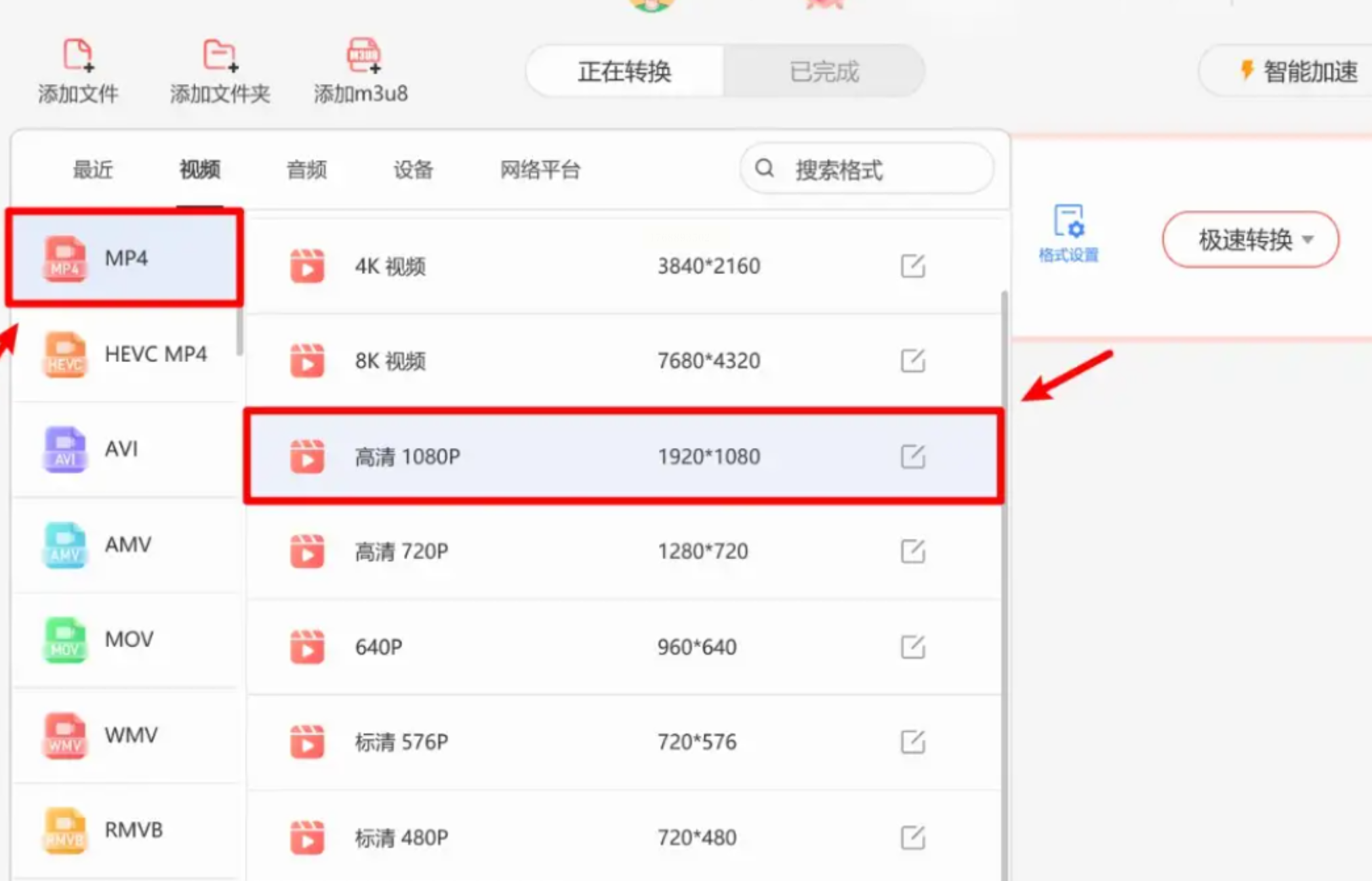 步骤二:在格式列表里选中MP4,其他选项保持默认。