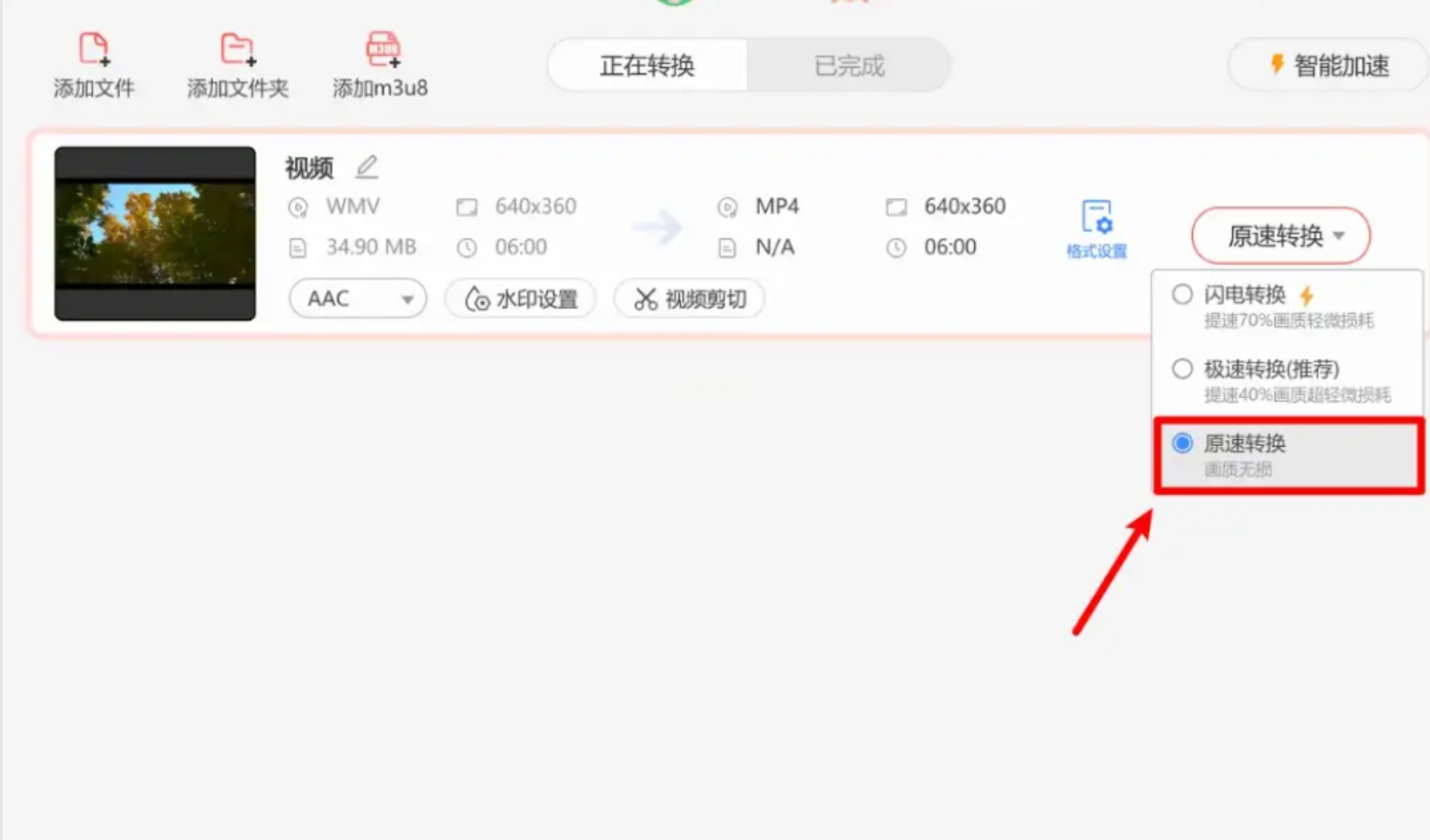 步骤一:添加文件后,优先选择“原速无损转换”模式。