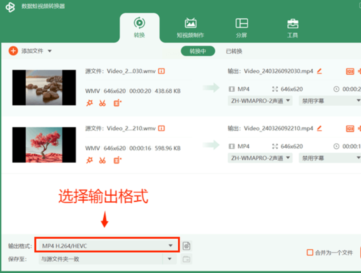 步骤二:通过拖拽或点击添加WMV文件,在输出设置中选定MP4格式,参数可按需调整。