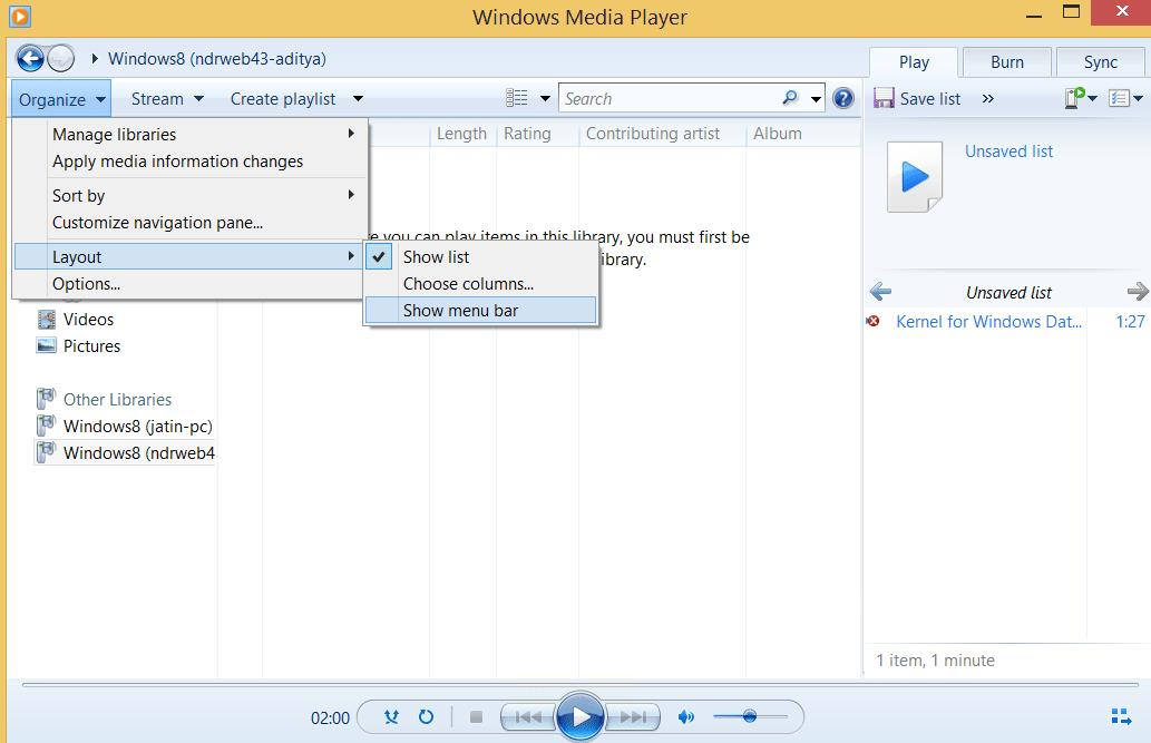 步骤1:在Windows电脑上打开“Windows Media Player”,如果看不到菜单栏,点击右上角的“Organize”(组织)按钮,选择“Layout”(布局)里的“Show Menu Bar”(显示菜单栏),这样就能看到完整的菜单了。