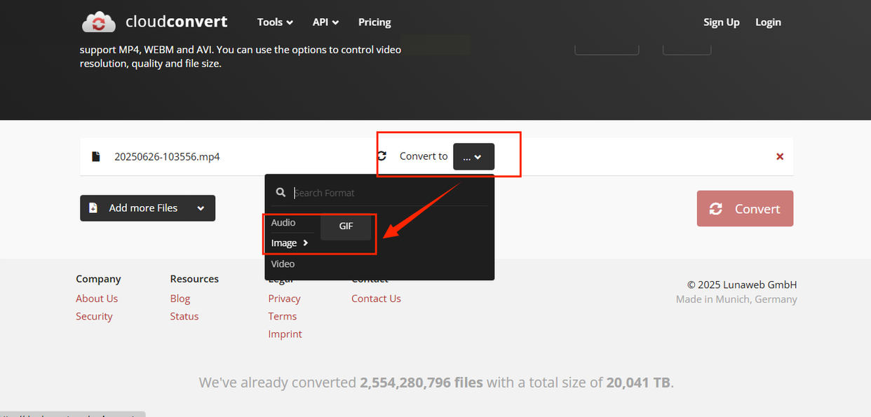 步骤二:文件上传成功后,在“Convert to”下拉选项中找到GIF格式,并选择它。