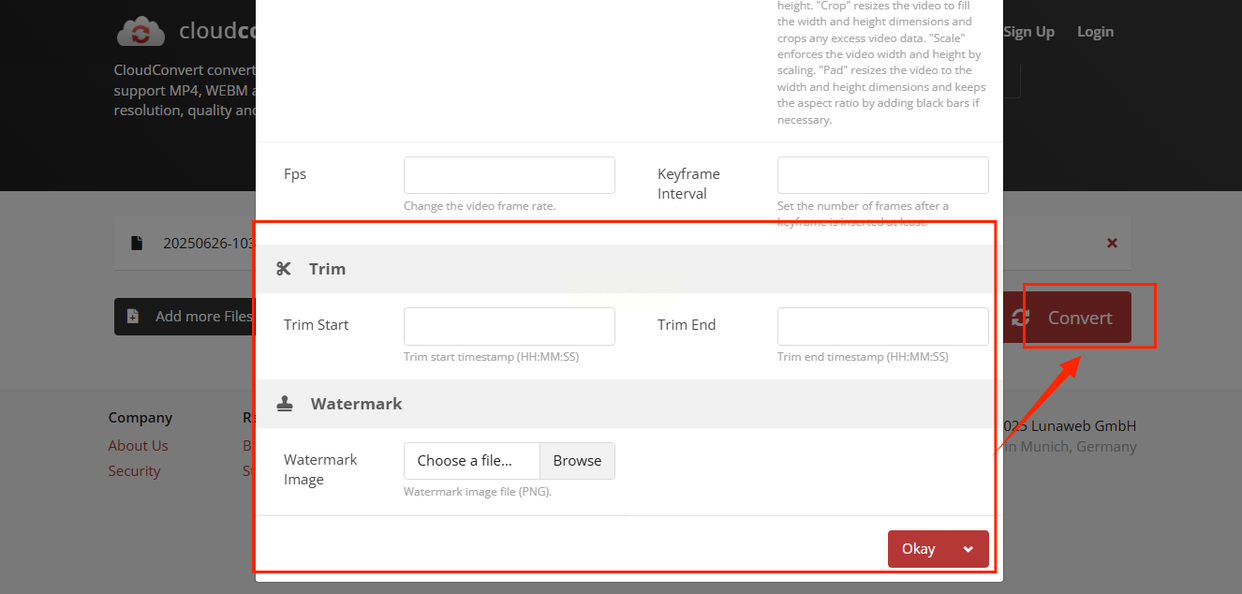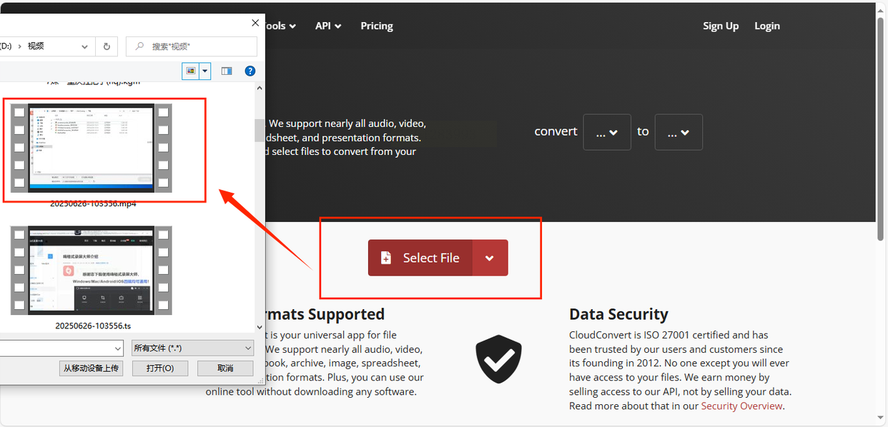 步骤一:进入CloudConvert主页,点击“选择文件”按钮,添加你的视频文件。支持MP4、MOV等主流格式。