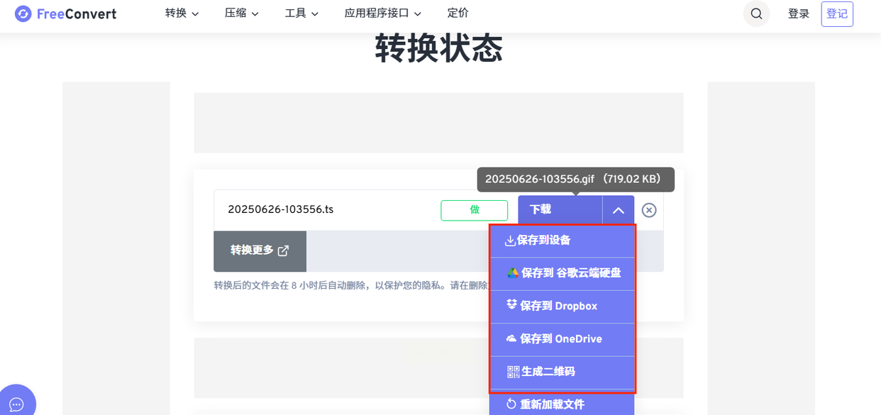 步骤三:设置完成后,点击“转换为GIF”按钮。等待转换结束,你可以选择将文件保存到本地设备,或者上传到云端存储服务如谷歌云端硬盘。