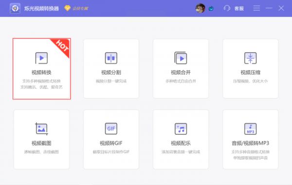 打开"烁光视频转换器",主界面第一个功能就是"视频转换",直接点进去。