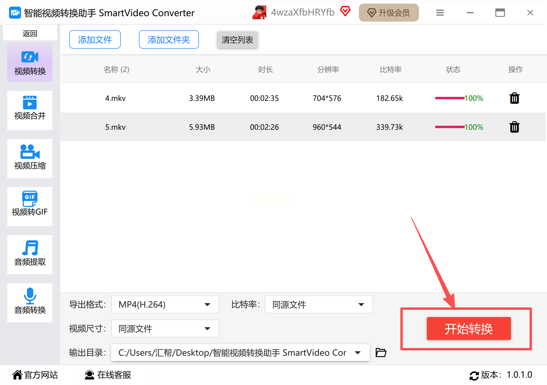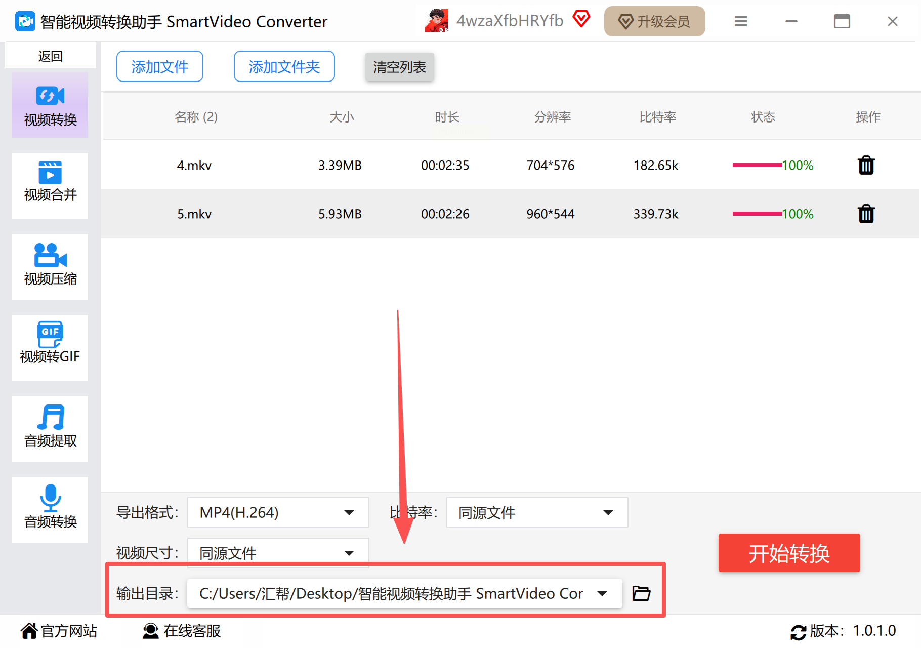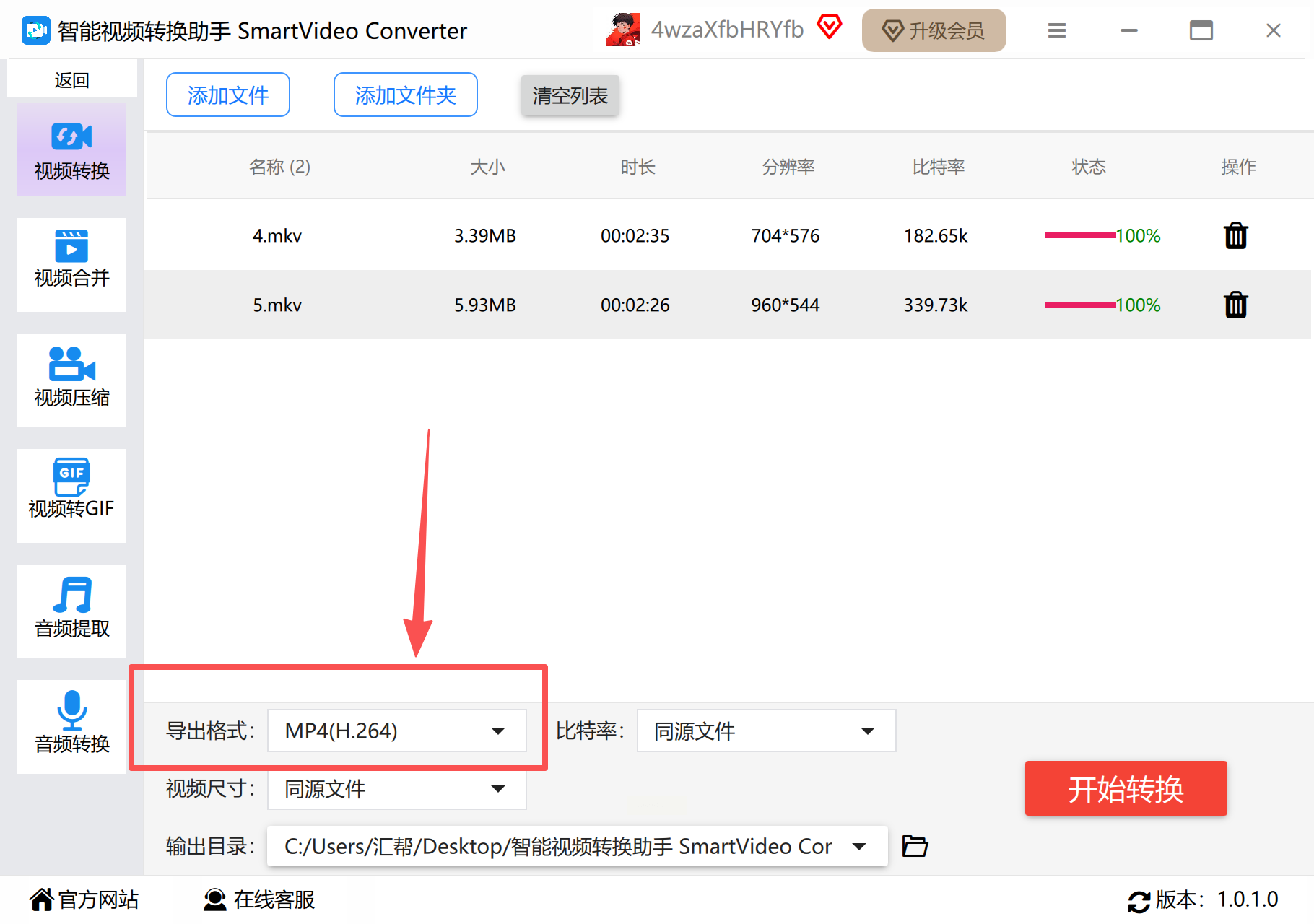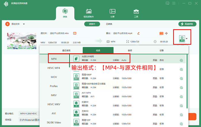 3. 在格式设置区,选择"MP4-与源文件相同"作为输出格式,这是最安全的转换模式,保留原视频编码特性。