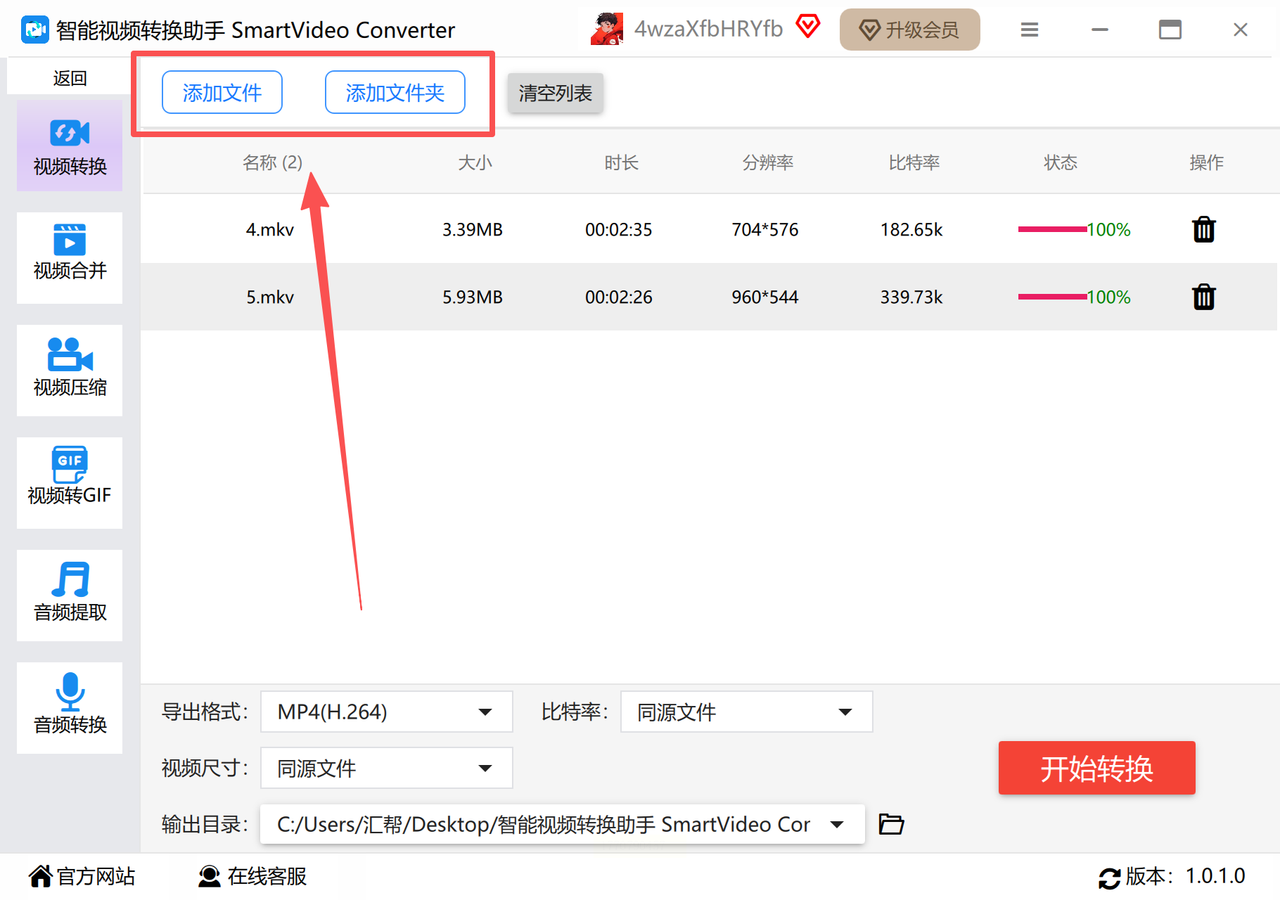 2. 通过顶部的"添加文件"按钮导入视频,支持直接拖拽文件到软件窗口,也可批量选择多个mkv文件进行转换。