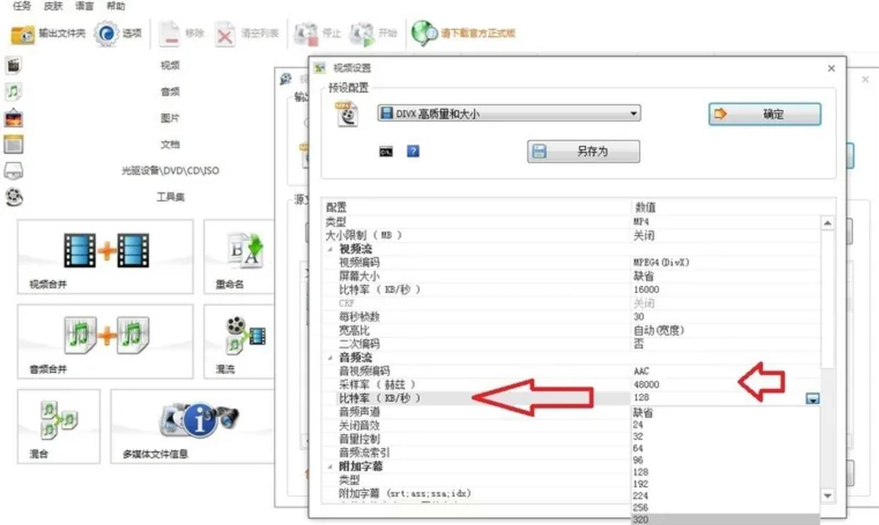 第六步:如果你想调整视频质量,可以切换到【转换】模式,点击【DIVX 高质量和大小】,进入参数设置页面。建议将视频的【比特率】和【每秒帧数】,以及音频的【比特率】和【采样率】都设置为最大值,这样能保证输出的视频是高清质量的。