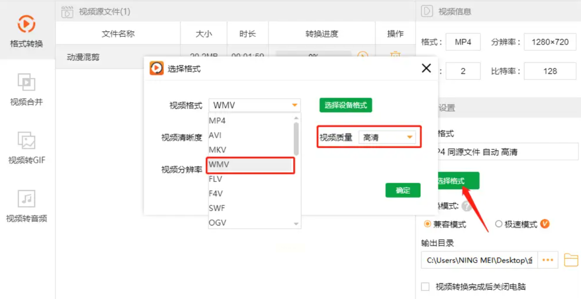 步骤三:在软件右侧的输出设置区域,点击“选择格式”。在弹出的格式菜单中,将视频格式设置为“WMV”,并可以根据需要选择对应的视频画质预设(如高清、原画等)。
