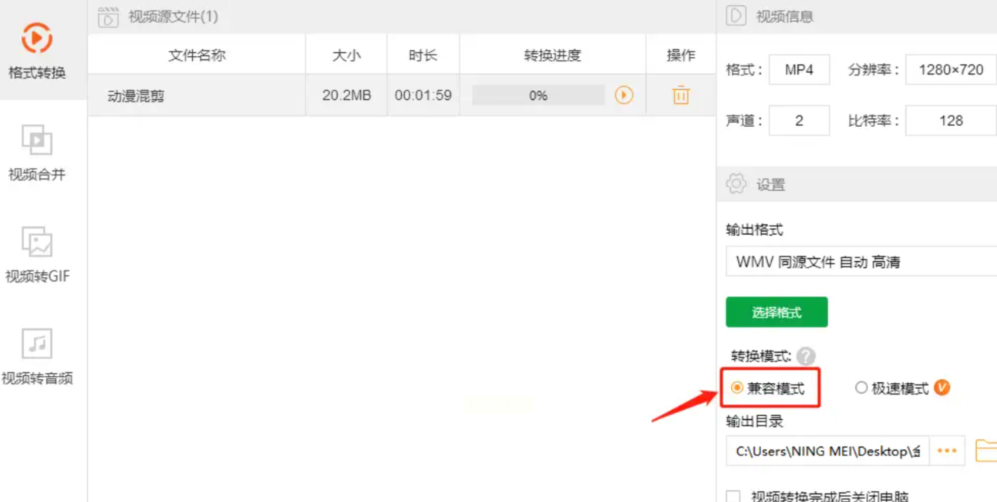 步骤四:确认输出格式后,在软件底部选择合适的转换模式(如高速转换或高精度编码)。