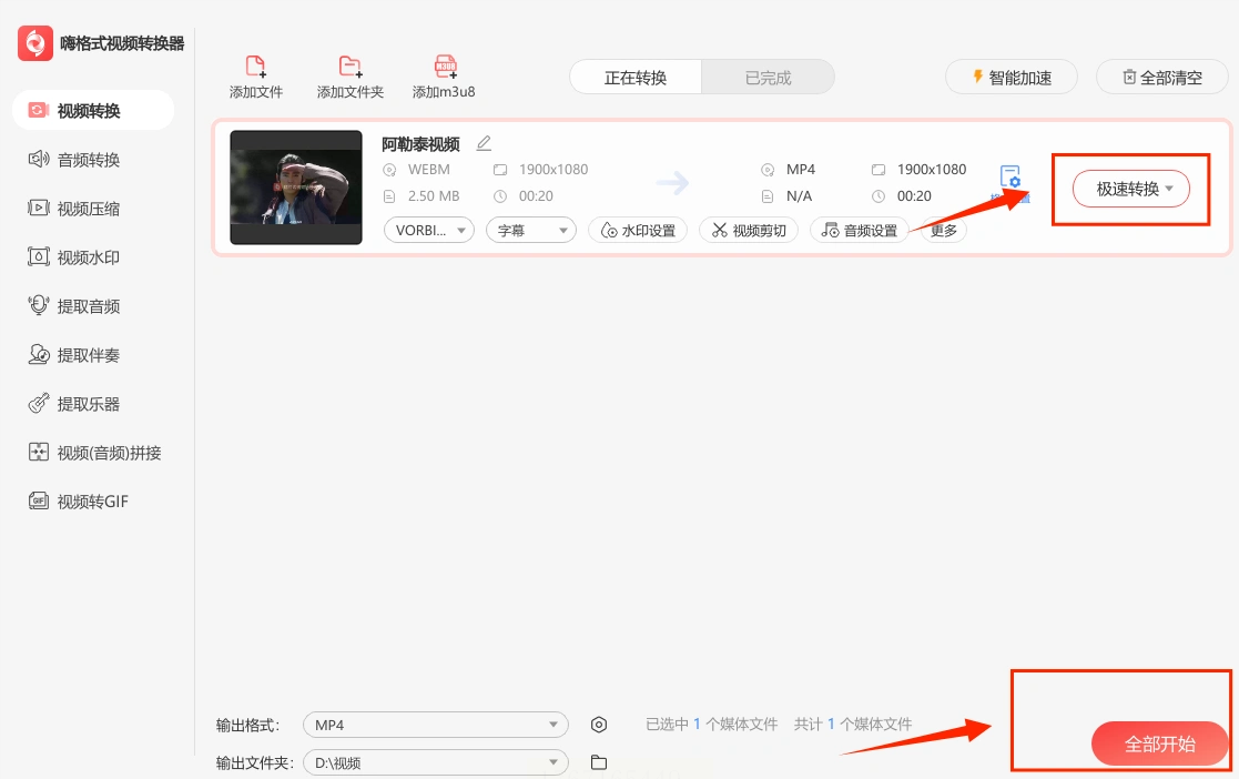 4. 转换执行:点击右下角“全部转换”按钮,软件采用硬件加速技术(需显卡支持)提升转换速度。