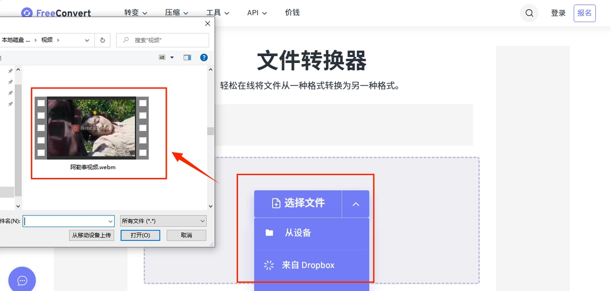 2. 文件上传:点击中央醒目的“选择文件”按钮,支持从本地硬盘、Google Drive、Dropbox或URL导入视频文件。