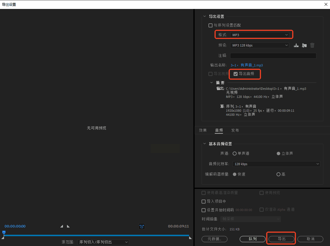 在Pr中导入视频后,将其拖入时间轴,使用快捷键调出导出设置,选择MP3格式并勾选“仅导出音频”。