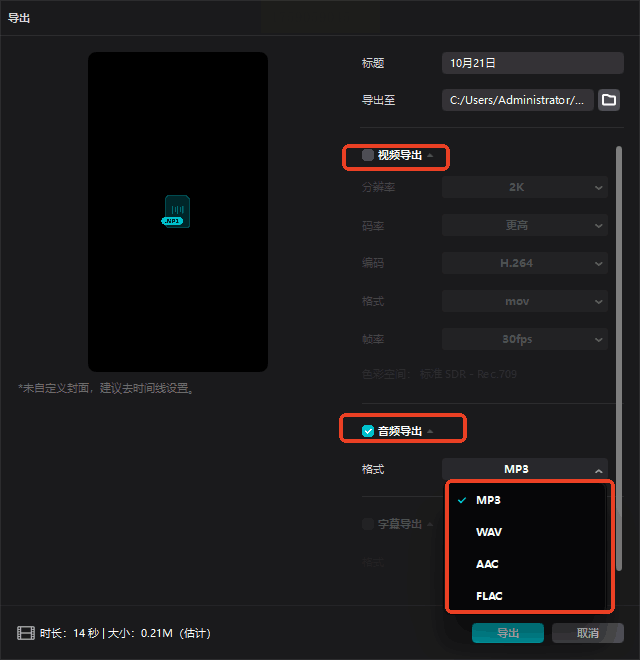 步骤三:在输出设置中,选择导出格式为MP3。您还可以根据需要调整音频比特率、采样率等参数,以优化音质和文件大小。