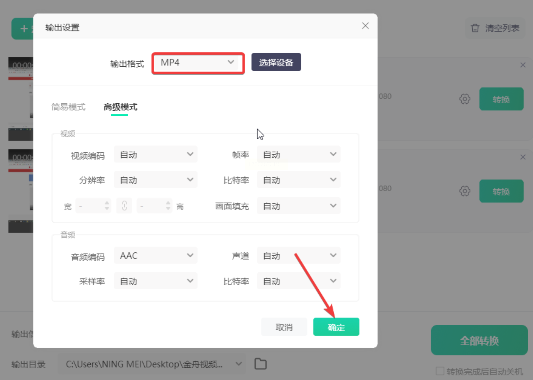在输出设置区域,将格式选定为“MP4”。你还可以根据需要,对编码器、分辨率等参数进行微调。点击“确定”保存设置。