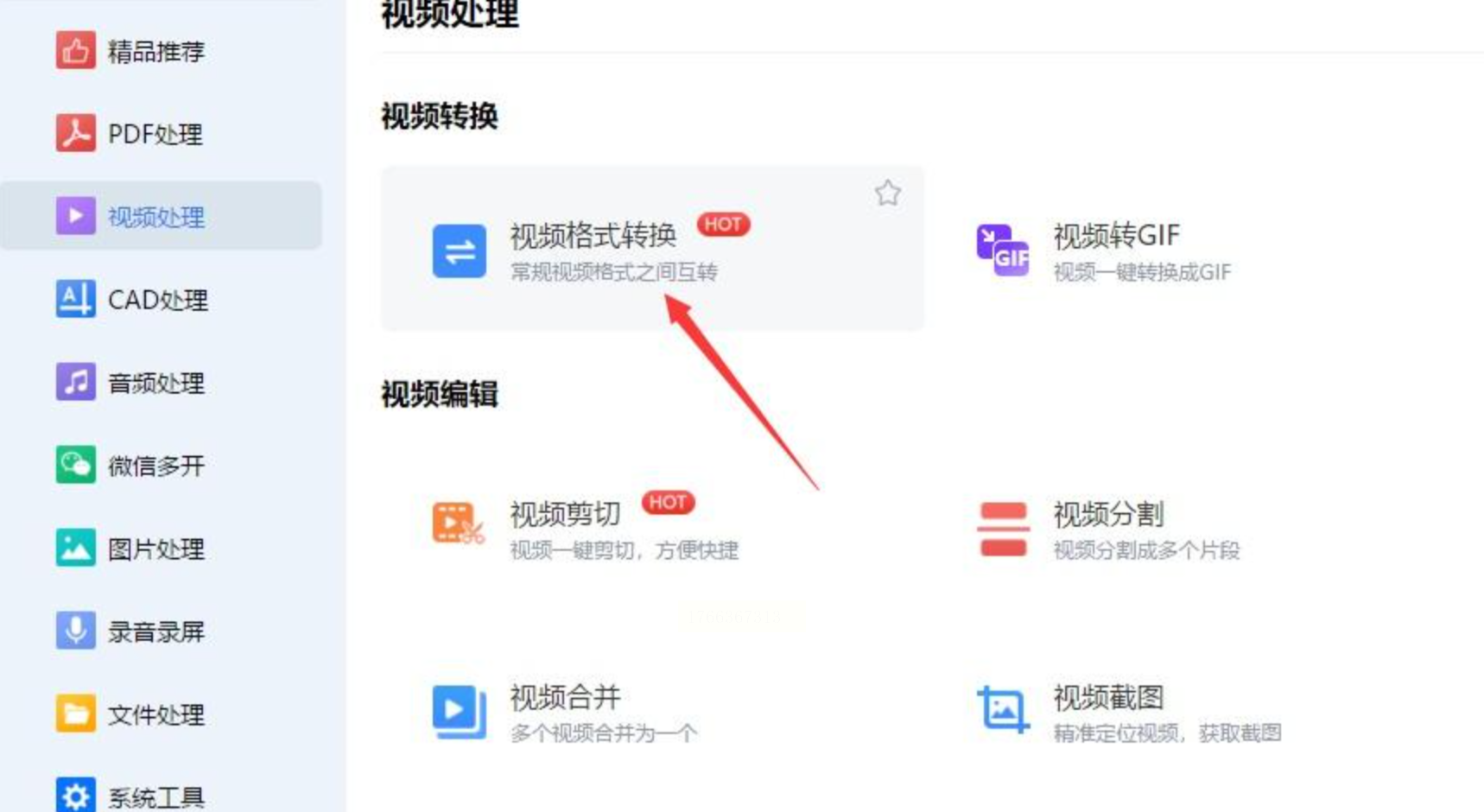 步骤一: 首次使用需要简单安装。打开软件,在左侧功能列表中找到“视频处理”大类,然后在右侧详细功能中点击“视频格式转换”。