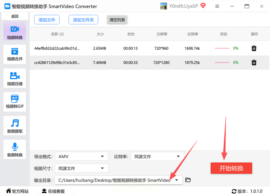 步骤六:点击开始转换按钮,等待处理完成即可获得AMV格式视频。