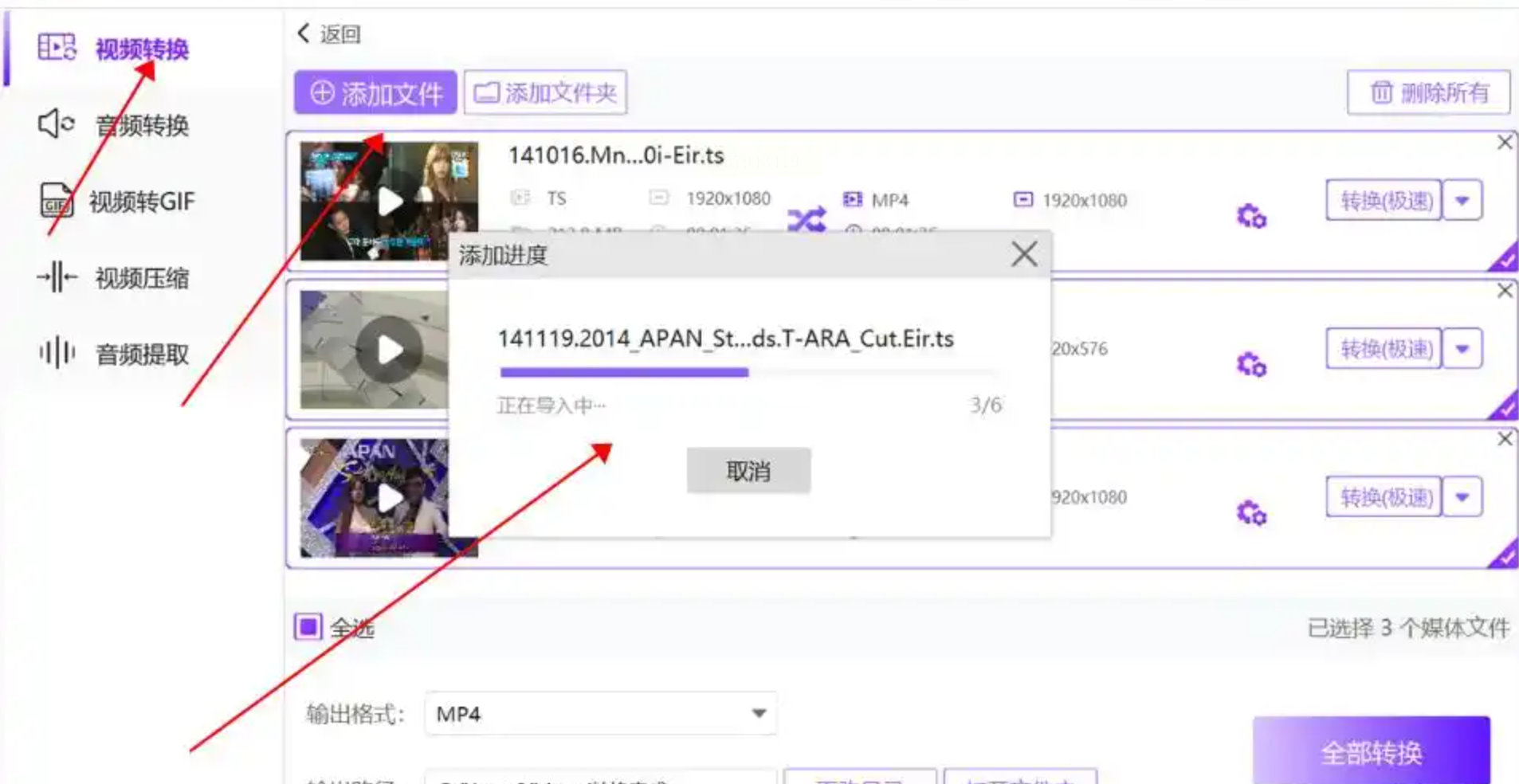 步骤三: 文件添加成功后,在输出设置区域,将“输出格式”明确选择为“MP4”。同时,你可以留意一下,软件是否还提供了其他你未来可能用到的格式选项,做到一举多得。