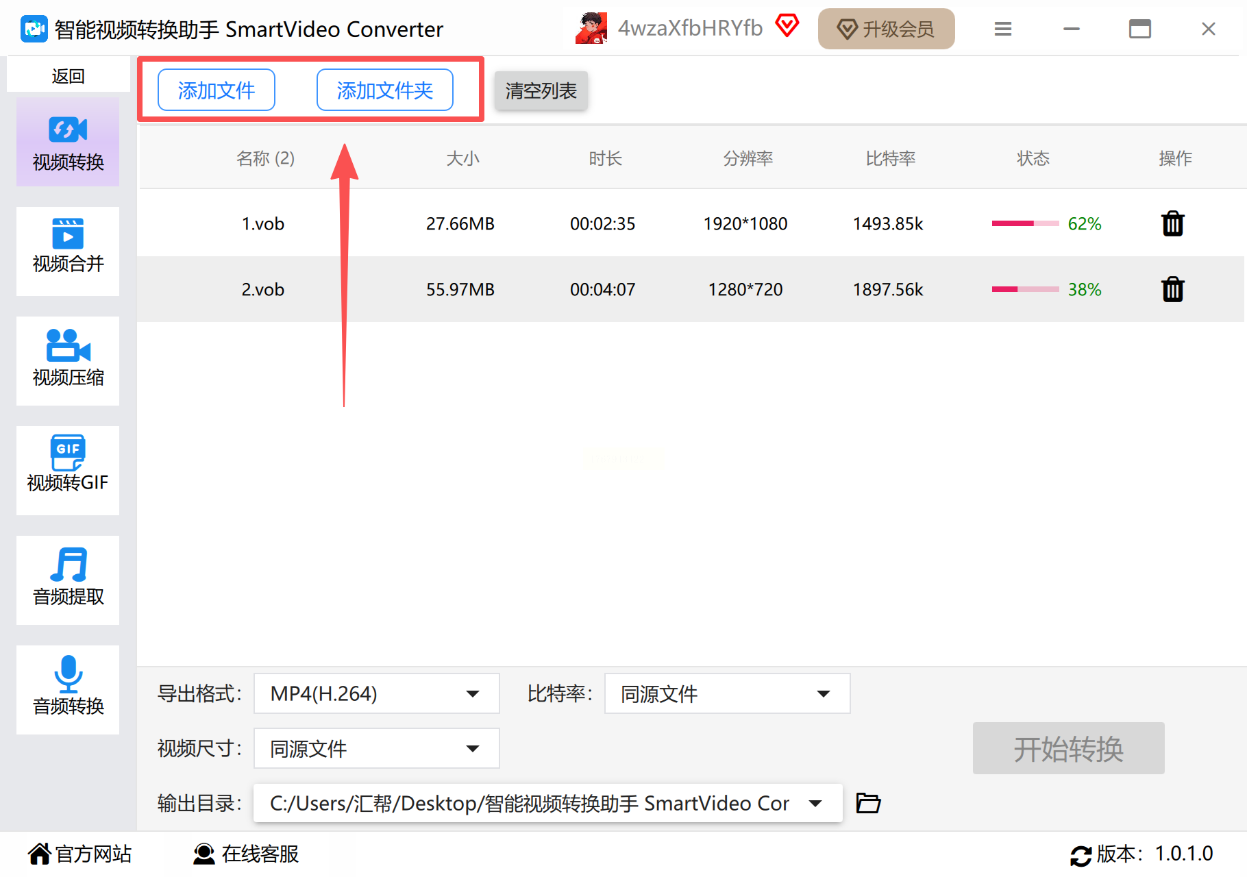 步骤二: 功能加载后,点击“添加文件”或类似按钮,将你的VOB视频导入到任务列表中。