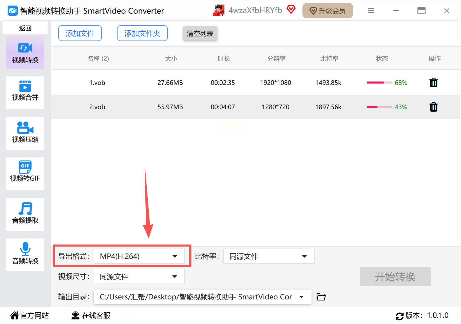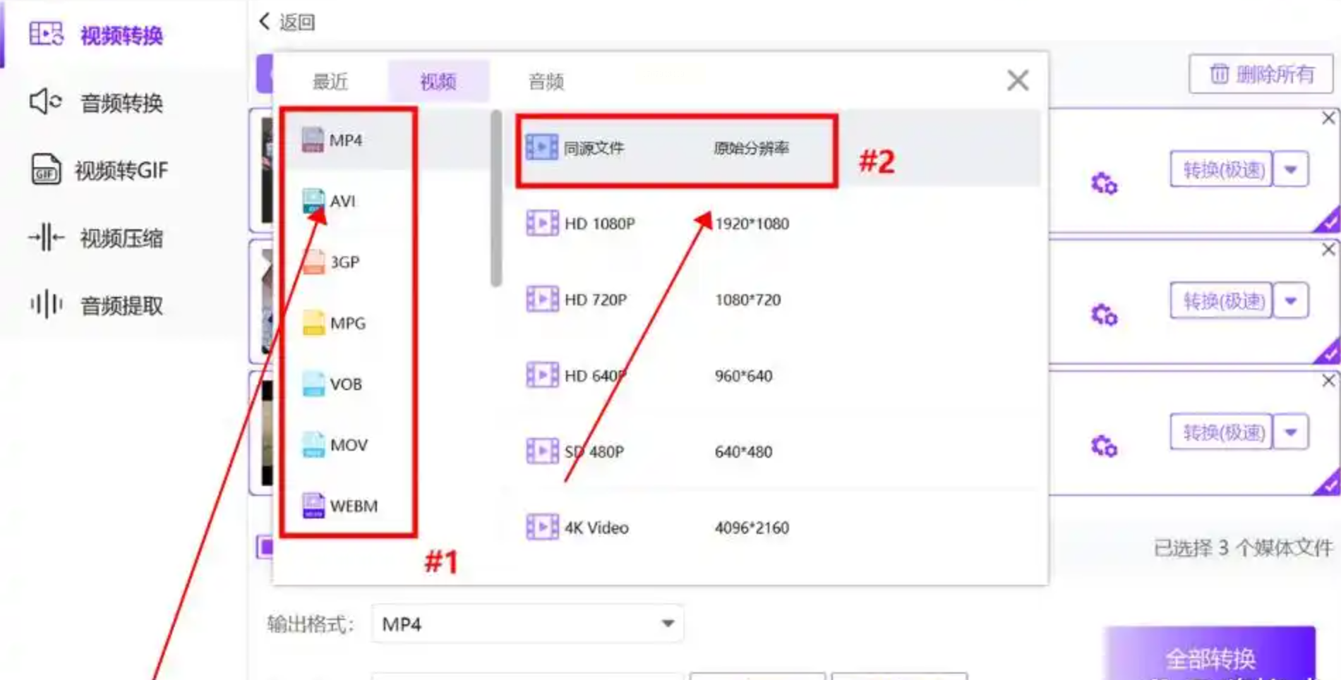步骤三: 所有待转换文件会列在下方。点击某个文件后的“输出格式”或“设置”选项,在弹出的格式列表中选择“MP4”。通常软件会智能推荐“同源文件”质量,你也可以手动调整分辨率等参数。