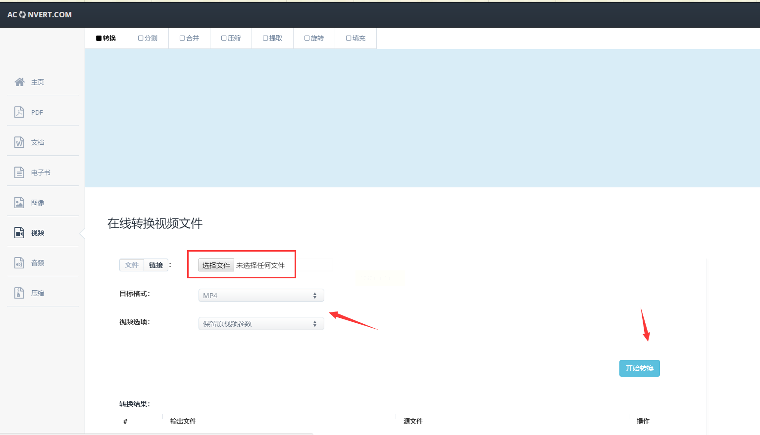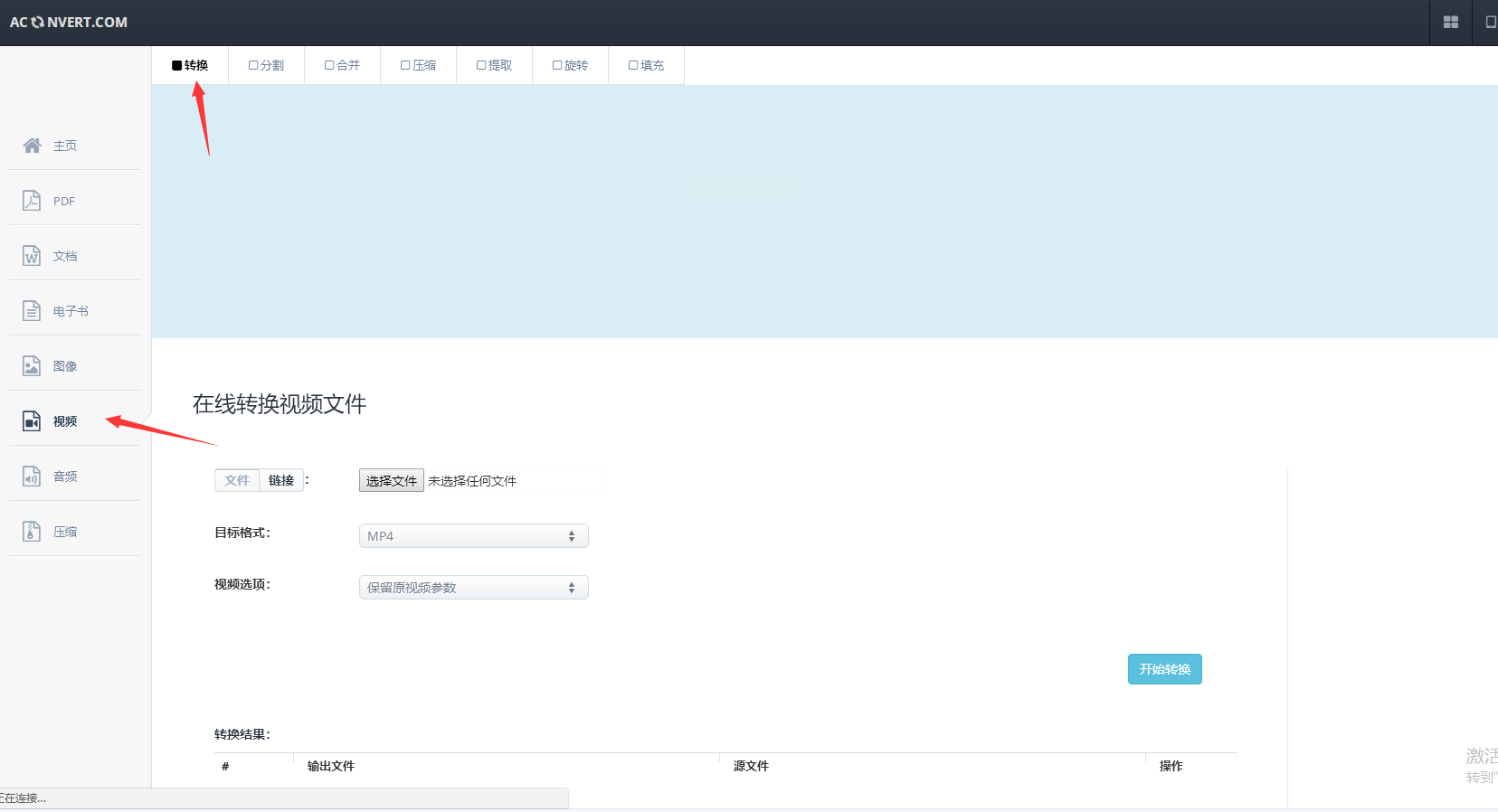 步骤一: 在浏览器中访问Aconvert网站。进入首页后,你会看到它提供了文档、图片、视频等多种转换工具。找到“视频”转换类别,并点击进入。