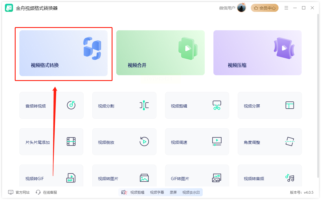 步骤一: 启动软件,主界面会像应用市场一样,清晰展示几个核心功能,如【视频转换】、【音频转换】等。我们直接点击【视频转换】这个功能图标进入。