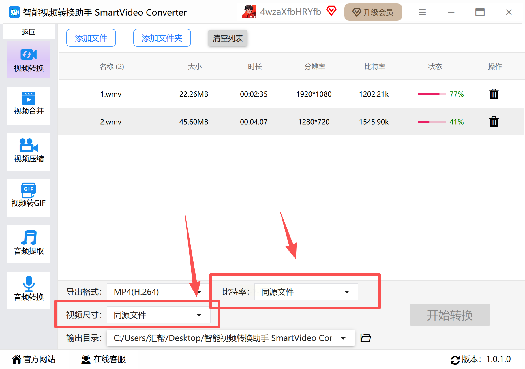 步骤三:选择MP4作为输出格式,软件会根据原文件属性推荐比特率和分辨率,用户也可手动调整。