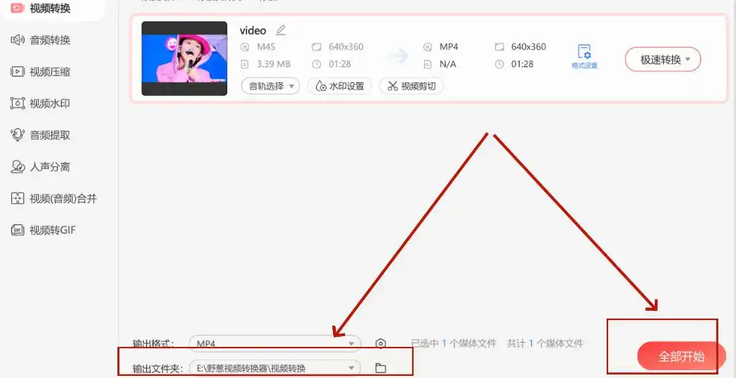 步骤二:在输出格式下拉菜单中,选择“MP4”作为目标格式,软件通常提供多种预设分辨率选项。
